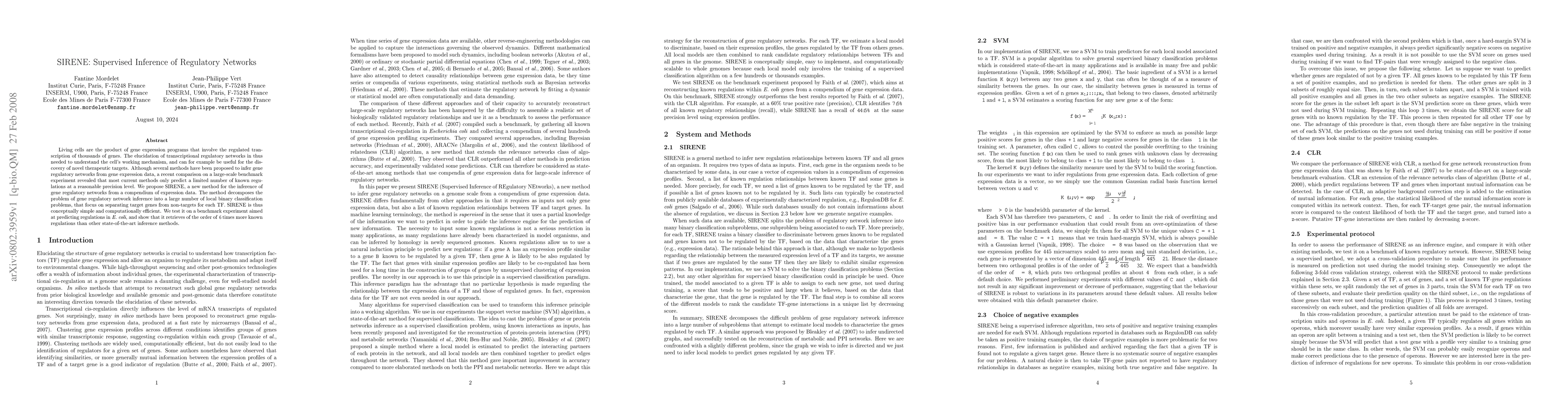 SIRENE is a new method for inferring gene regulatory networks from gene expression data by decomposing the problem into local binary classification tasks. It outperforms existing methods by predicting six times more known regulations in E. coli, demonstrating its superior precision and efficiency.