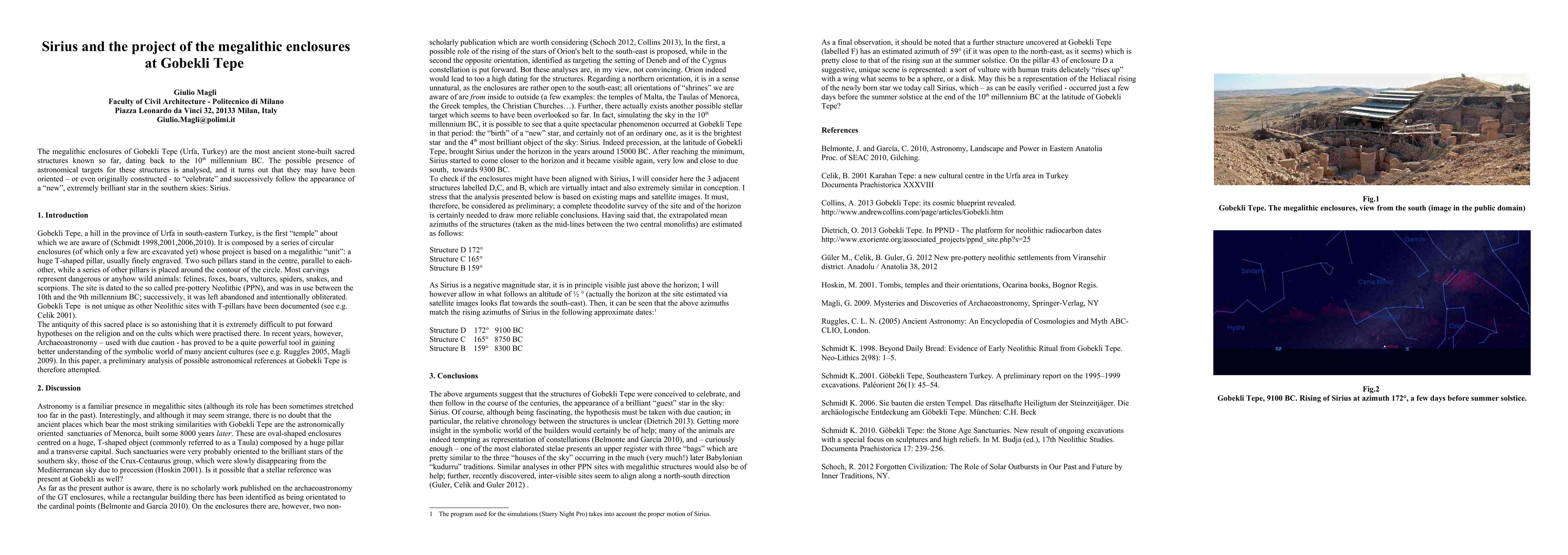 This paper investigates the megalithic enclosures at Gobekli Tepe, the oldest known sacred stone structures, and hypothesizes that they were oriented to track the appearance of the star Sirius in the southern skies, suggesting a possible astronomical significance.