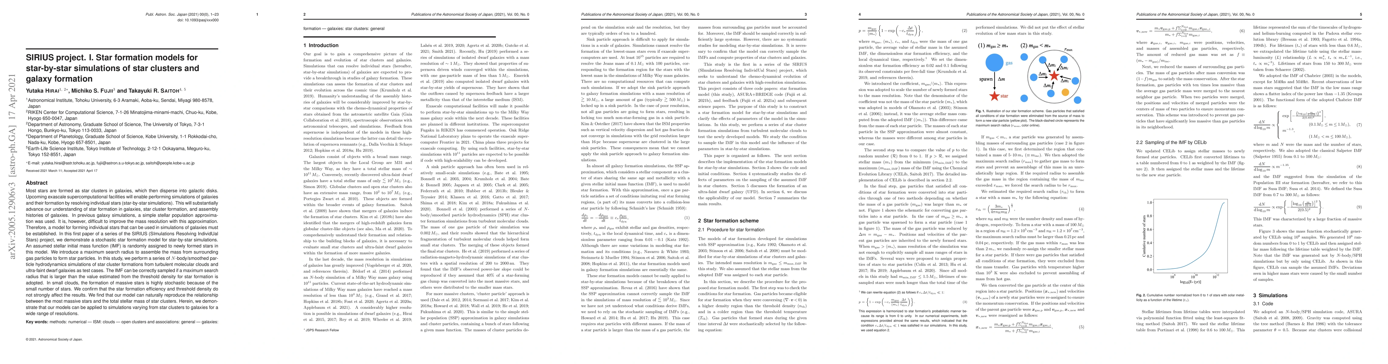 Most stars are formed as star clusters in galaxies, which then disperse into galactic disks. Upcoming exascale supercomputational facilities will enable performing simulations of galaxies and their formation by resolving individual stars (star-by-star simulations). This will substantially advance our understanding of star formation in galaxies, star cluster formation, and assembly histories of galaxies. In previous galaxy simulations, a simple stellar population approximation was used. It is, however, difficult to improve the mass resolution with this approximation. Therefore, a model for forming individual stars that can be used in simulations of galaxies must be established. In this first paper of a series of the SIRIUS (SImulations Resolving IndividUal Stars) project, we demonstrate a stochastic star formation model for star-by-star simulations. An assumed stellar initial mass function (IMF) is randomly assigned to newly formed stars. We introduce a maximum search radius to assemble the mass from surrounding gas particles to form star particles. In this study, we perform a series of N-body/smoothed particle hydrodynamics simulations of star cluster formations from turbulent molecular clouds and ultra-faint dwarf galaxies as test cases. The IMF can be correctly sampled if a maximum search radius that is larger than the value estimated from the threshold density for star formation is adopted. In small clouds, the formation of massive stars is highly stochastic because of the small number of stars. We confirm that the star formation efficiency and threshold density do not strongly affect the results. We find that our model can naturally reproduce the relationship between the most massive stars and the total stellar mass of star clusters. Herein, we demonstrate that our models can be applied to simulations varying from star clusters to galaxies for a wide range of resolutions.