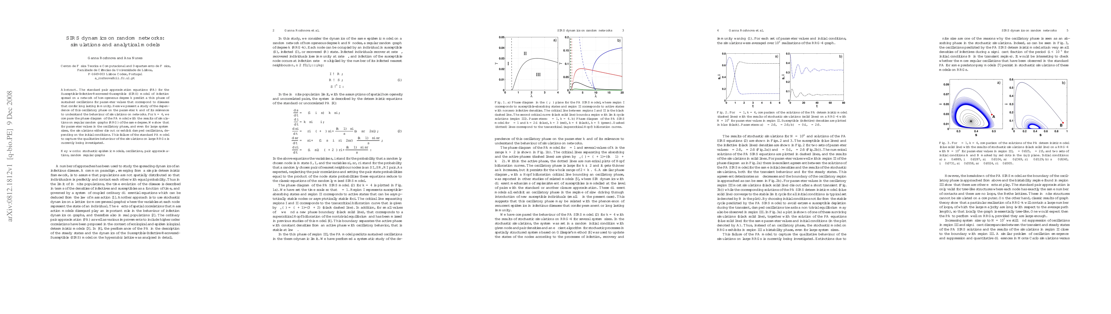 This paper investigates the dynamics of the SIRS model on random networks, comparing analytical pair approximation models with simulation results on regular random graphs. It finds that while the PA model predicts sustained oscillations, simulations show either disease die-out or damped oscillations, indicating discrepancies between theory and large-scale network behavior.