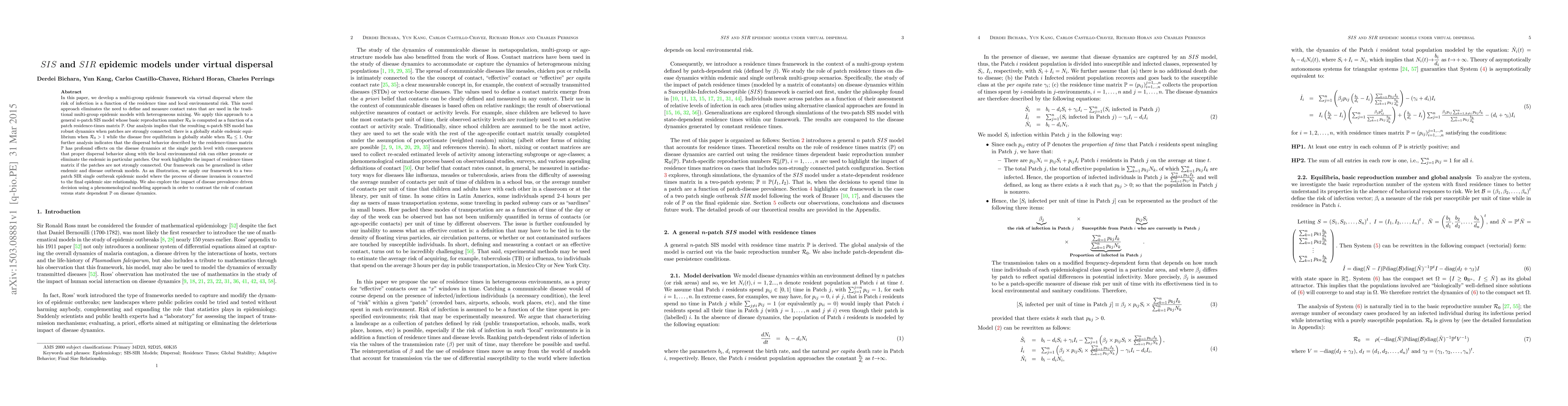 In this paper, we develop a multi-group epidemic framework via virtual dispersal where the risk of infection is a function of the residence time and local environmental risk. This novel approach eliminates the need to define and measure contact rates that are used in the traditional multi-group epidemic models with heterogeneous mixing. We apply this approach to a general $n$-patch SIS model whose basic reproduction number $\mathcal R_0 $ is computed as a function of a patch residence-times matrix $\mathbb P$. Our analysis implies that the resulting $n$-patch SIS model has robust dynamics when patches are strongly connected: there is a globally stable endemic equilibrium when $\mathcal R_0>1 $ while the disease free equilibrium is globally stable when $\mathcal R_0\leq1 $. Our further analysis indicates that the dispersal behavior described by the residence-times matrix $\mathbb P$ has profound effects on the disease dynamics at the single patch level with consequences that proper dispersal behavior along with the local environmental risk can either promote or eliminate the endemic in particular patches. Our work highlights the impact of residence times matrix if the patches are not strongly connected. Our framework can be generalized in other endemic and disease outbreak models. As an illustration, we apply our framework to a two-patch SIR single outbreak epidemic model where the process of disease invasion is connected to the final epidemic size relationship. We also explore the impact of disease prevalence driven decision using a phenomenological modeling approach in order to contrast the role of constant versus state dependent $\mathbb P$ on disease dynamics.