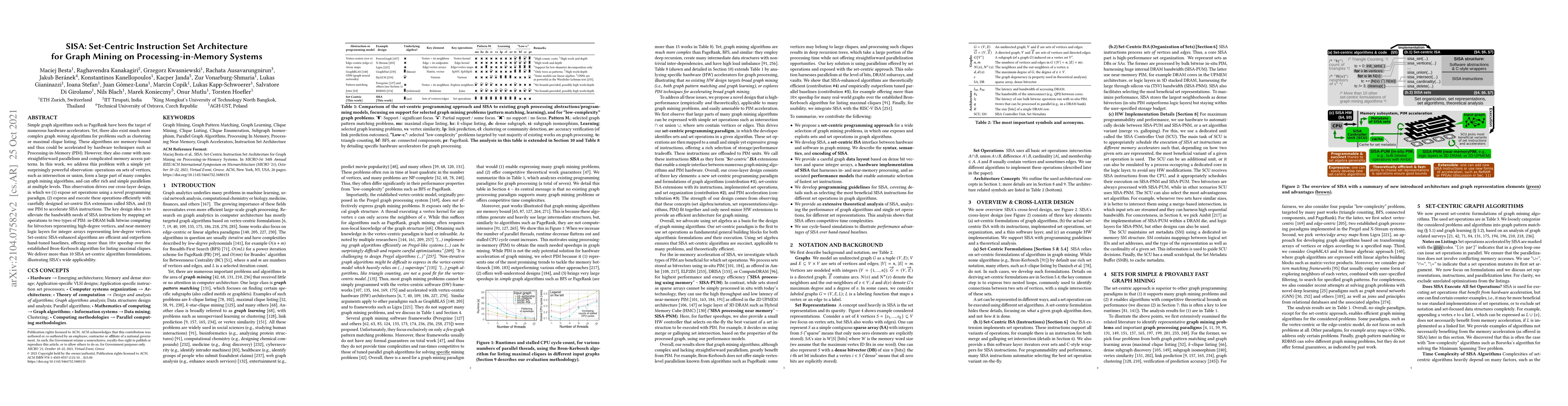 This paper proposes SISA, a set-centric instruction set architecture designed to accelerate complex graph mining algorithms on Processing-in-Memory systems. By leveraging set operations and PIM, SISA achieves significant speedups, offering over 10x improvement for maximal clique listing compared to traditional methods.