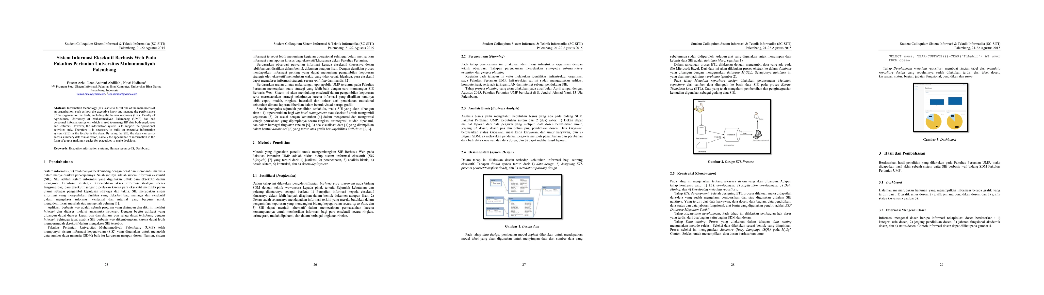 Information technology (IT) is able to fulfill one of the main needs of an organization, such as how the executive know and manage the performance of the organization he leads, including the human resources (HR). Faculty of Agriculture, University of Muhammadiyah Palembang (UMP) has had personnel information system which is used to manage HR data both employees and lecturers. However, the information system is to support the operational activities only. Therefore it is necessary to build an executive information system (SIE) in the faculty is the dean. By using the SIE, the dean can easily access summary data visualization, namely the appearance of information in the form of graphs making it easier for executives to make decisions.