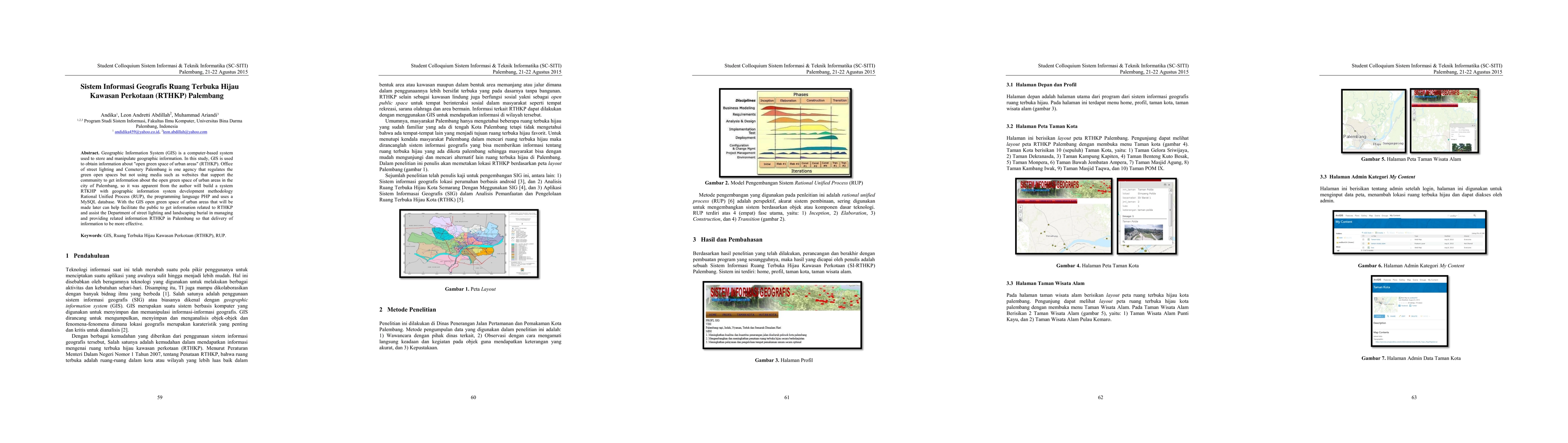 Geographic Information System (GIS) is a computer-based system used to store and manipulate geographic information. In this study, GIS is used to obtain information about "open green space of urban areas" (RTHKP). Office of street lighting and Cemetery Palembang is one agency that regulates the green open spaces but not using media such as websites that support the community to get information about the open green space of urban areas in the city of Palembang, so it was apparent from the author will build a system RTKHP with geographic information system development methodology Rational Unified Process (RUP), the programming language PHP and uses a MySQL database. With the GIS open green space of urban areas that will be made later can help facilitate the public to get information related to RTHKP and assist the Department of street lighting and landscaping burial in managing and providing related information RTHKP in Palembang so that delivery of information to be more effective.