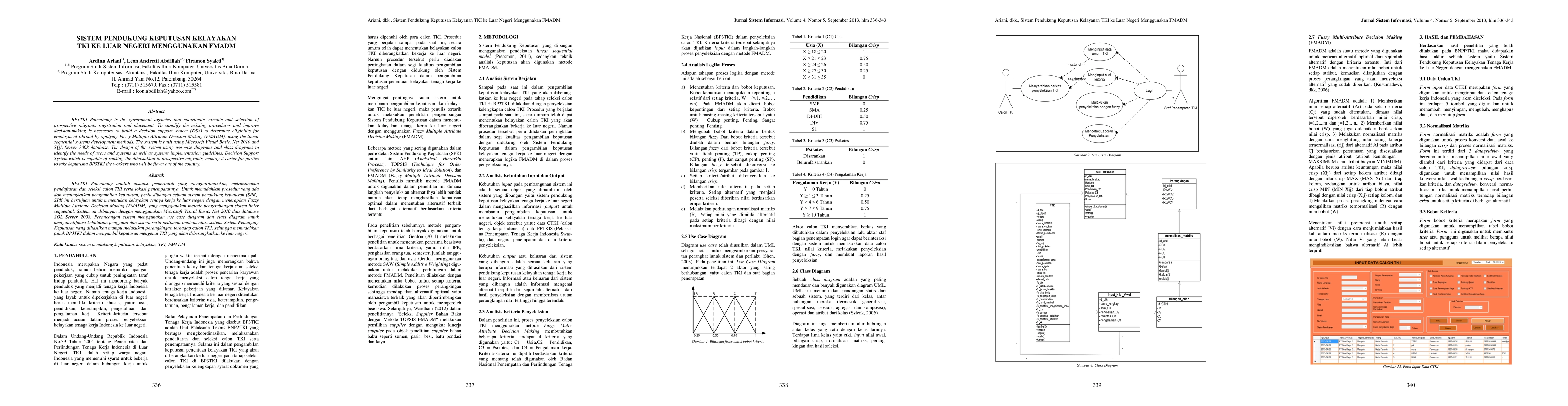 BP3TKI Palembang is the government agencies that coordinate, execute and selection of prospective migrants registration and placement. To simplify the existing procedures and improve decision-making is necessary to build a decision support system (DSS) to determine eligibility for employment abroad by applying Fuzzy Multiple Attribute Decision Making (FMADM), using the linear sequential systems development methods. The system is built using Microsoft Visual Basic. Net 2010 and SQL Server 2008 database. The design of the system using use case diagrams and class diagrams to identify the needs of users and systems as well as systems implementation guidelines. This Decision Support System able to rank and produce the prospective migrants, making it easier for parties to take decision BP3TKI the workers who will be working out of the country.