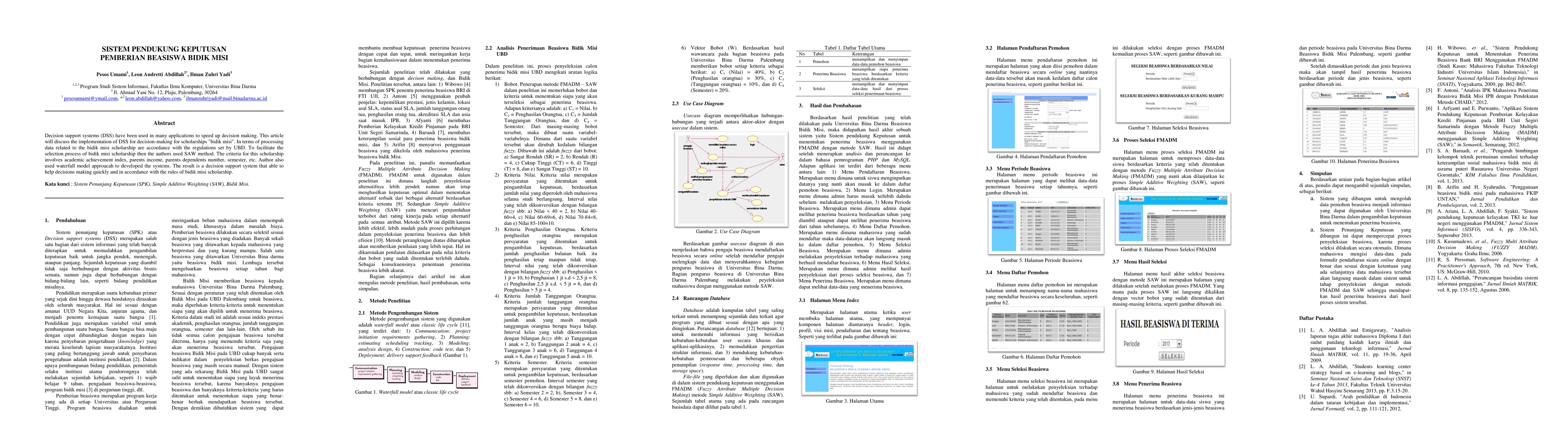 Decision support systems (DSS) have been used in many applications to speed up decision making. This article will discuss the implementation of DSS for decision-making for scholarships "bidik misi". In terms of processing data related to the bidik misi scholarship are accordance with the regulations set by UBD. To facilitate the selection process of bidik misi scholarship then the authors used SAW method. The criteria for this scholarship involves academic achievement index, parents income, parents dependents number, semester, etc. Author also used waterfall model approach to developed the systems. The result is a decision support system that able to help decisions making quickly and in accordance with the rules of bidik misi scholarship.