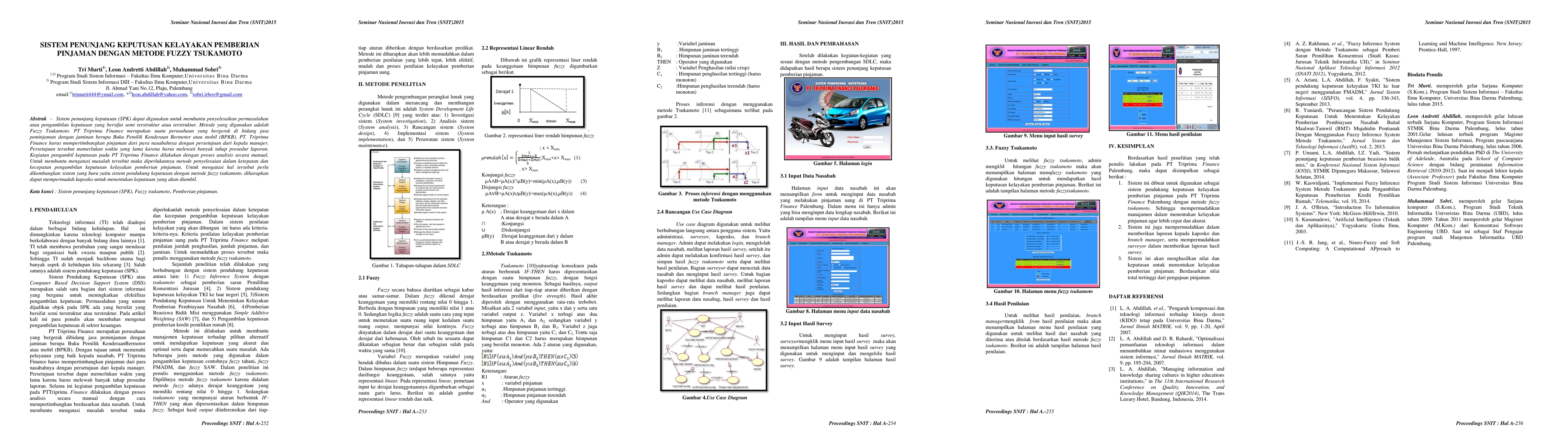 Decision support systems (DSS) can be used to help settlement issues or decisions that are semi-structured or structured. The method used is Fuzzy Tsukamoto. PT Triprima Finance is a company engaged in the service sector lending with collateral in the form of Motor Vehicle Owner Book or car (reg). PT. Triprima Finance should consider borrowing from its customers with the consent of the head manager. Such approval requires a long time because they have to pass through many stages of the reporting procedure. Decision-making activities at PT Triprima Finance carried out by the analysis process manually. To help overcome these problems, the need for completion method in accuracy and speed of decision making feasibility of lending. To overcome this need to develop a new system that is a decision support system Tsukamoto fuzzy method. is expected to facilitate kaposko to determine the decisions to be taken.