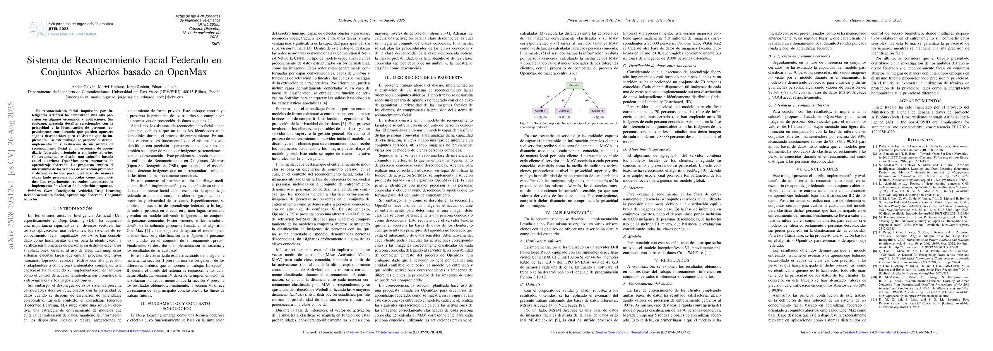 Facial recognition powered by Artificial Intelligence has achieved high accuracy in specific scenarios and applications. Nevertheless, it faces significant challenges regarding privacy and identity management, particularly when unknown individuals appear in the operational context. This paper presents the design, implementation, and evaluation of a facial recognition system within a federated learning framework tailored to open-set scenarios. The proposed approach integrates the OpenMax algorithm into federated learning, leveraging the exchange of mean activation vectors and local distance measures to reliably distinguish between known and unknown subjects. Experimental results validate the effectiveness of the proposed solution, demonstrating its potential for enhancing privacy-aware and robust facial recognition in distributed environments. -- El reconocimiento facial impulsado por Inteligencia Artificial ha demostrado una alta precisi\'on en algunos escenarios y aplicaciones. Sin embargo, presenta desaf\'ios relacionados con la privacidad y la identificaci\'on de personas, especialmente considerando que pueden aparecer sujetos desconocidos para el sistema que lo implementa. En este trabajo, se propone el dise\~no, implementaci\'on y evaluaci\'on de un sistema de reconocimiento facial en un escenario de aprendizaje federado, orientado a conjuntos abiertos. Concretamente, se dise\~na una soluci\'on basada en el algoritmo OpenMax para escenarios de aprendizaje federado. La propuesta emplea el intercambio de los vectores de activaci\'on promedio y distancias locales para identificar de manera eficaz tanto personas conocidas como desconocidas. Los experimentos realizados demuestran la implementaci\'on efectiva de la soluci\'on propuesta.