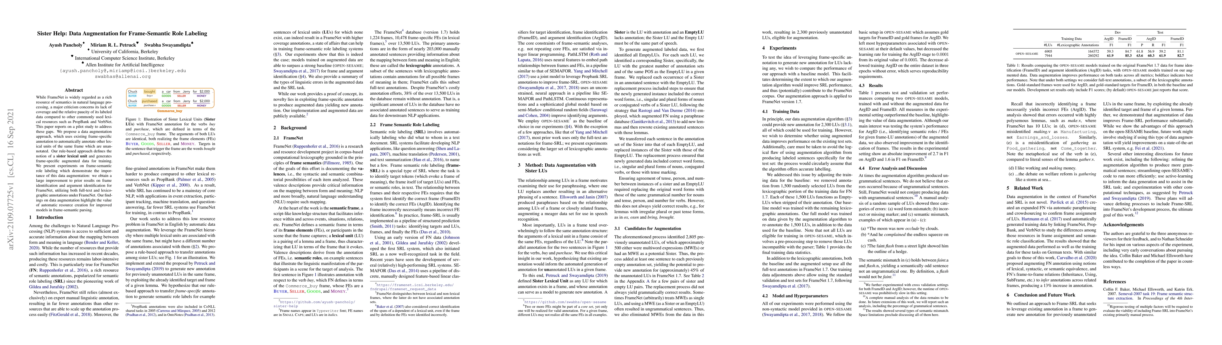 While FrameNet is widely regarded as a rich resource of semantics in natural language processing, a major criticism concerns its lack of coverage and the relative paucity of its labeled data compared to other commonly used lexical resources such as PropBank and VerbNet. This paper reports on a pilot study to address these gaps. We propose a data augmentation approach, which uses existing frame-specific annotation to automatically annotate other lexical units of the same frame which are unannotated. Our rule-based approach defines the notion of a sister lexical unit and generates frame-specific augmented data for training. We present experiments on frame-semantic role labeling which demonstrate the importance of this data augmentation: we obtain a large improvement to prior results on frame identification and argument identification for FrameNet, utilizing both full-text and lexicographic annotations under FrameNet. Our findings on data augmentation highlight the value of automatic resource creation for improved models in frame-semantic parsing.