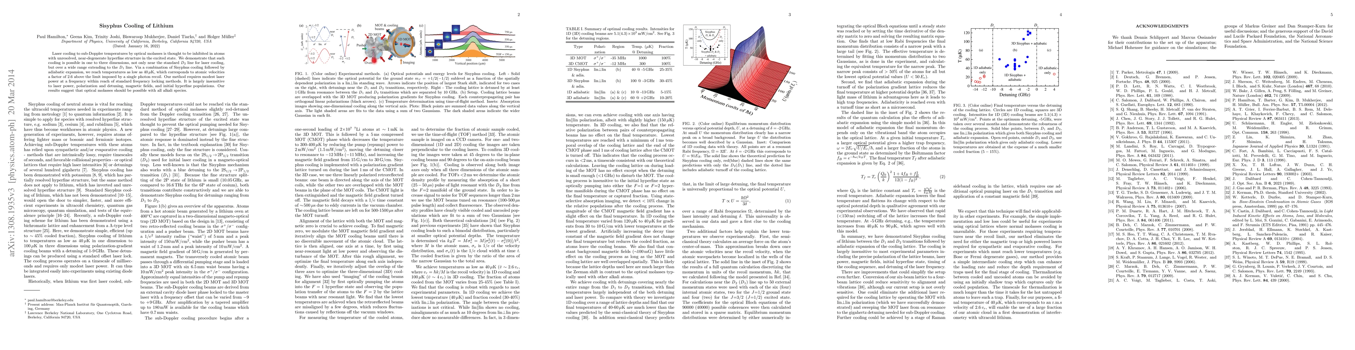 This paper demonstrates Sisyphus cooling of lithium atoms, achieving sub-Doppler temperatures over a range extending to the D1 line, reaching 40 μK. The method is robust against various experimental conditions and suggests optical molasses may be feasible for all alkali species.