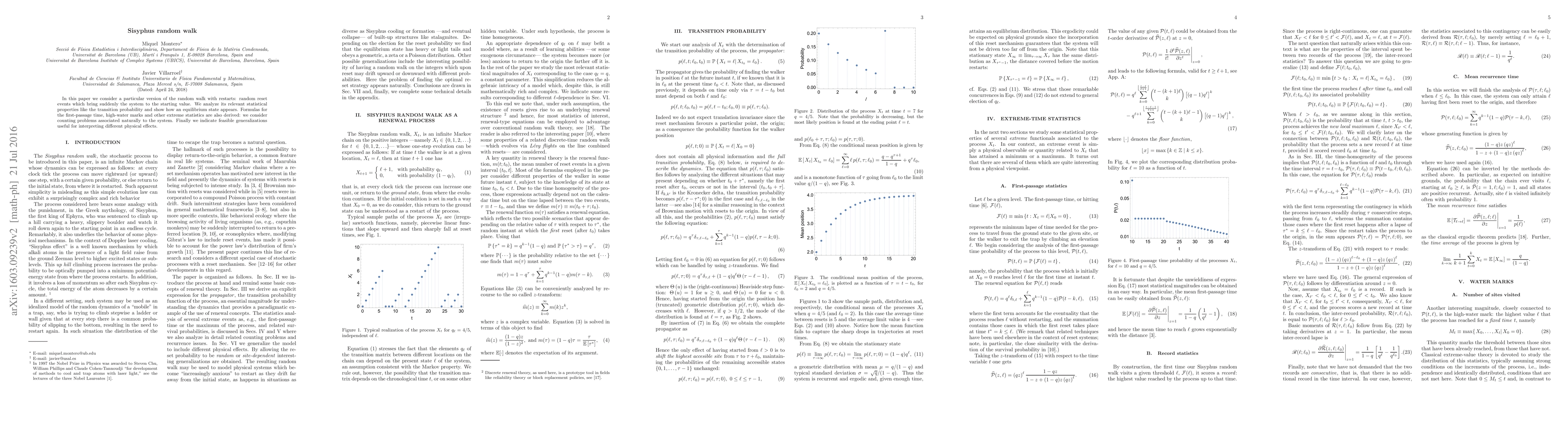 In this paper we consider a particular version of the random walk with restarts: random reset events which bring suddenly the system to the starting value. We analyze its relevant statistical properties like the transition probability and show how an equilibrium state appears. Formulas for the first-passage time, high-water marks and other extreme statistics are also derived: we consider counting problems associated naturally to the system. Finally we indicate feasible generalizations useful for interpreting different physical effects.