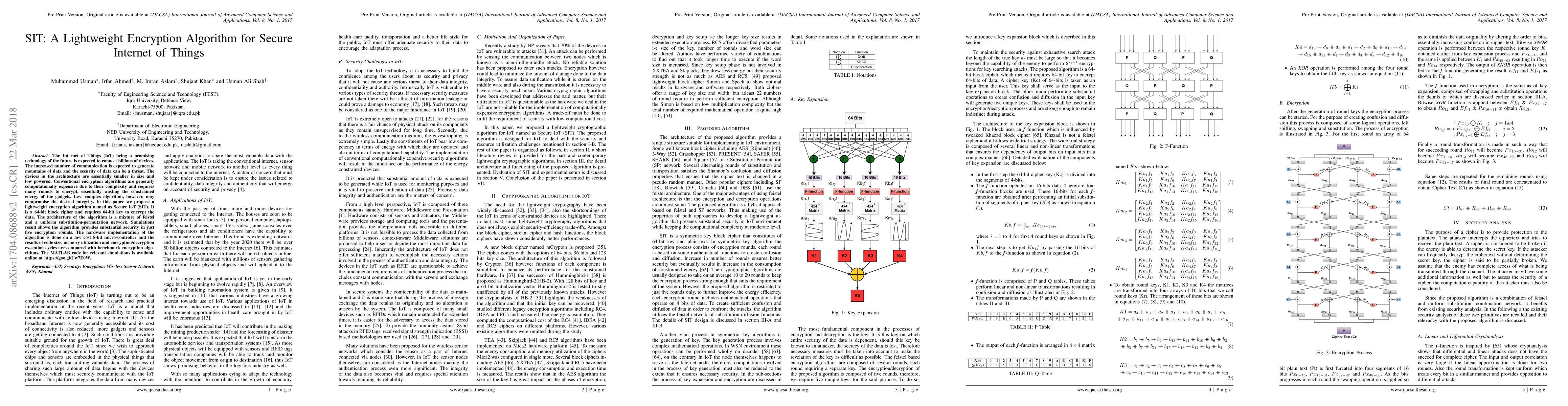 This paper proposes a lightweight encryption algorithm named Secure IoT (SIT) designed for the security of Internet of Things (IoT) devices, balancing security and computational efficiency. SIT, a 64-bit block cipher with a 64-bit key, uses a combination of Feistel network and substitution-permutation techniques, providing substantial security in just five rounds.