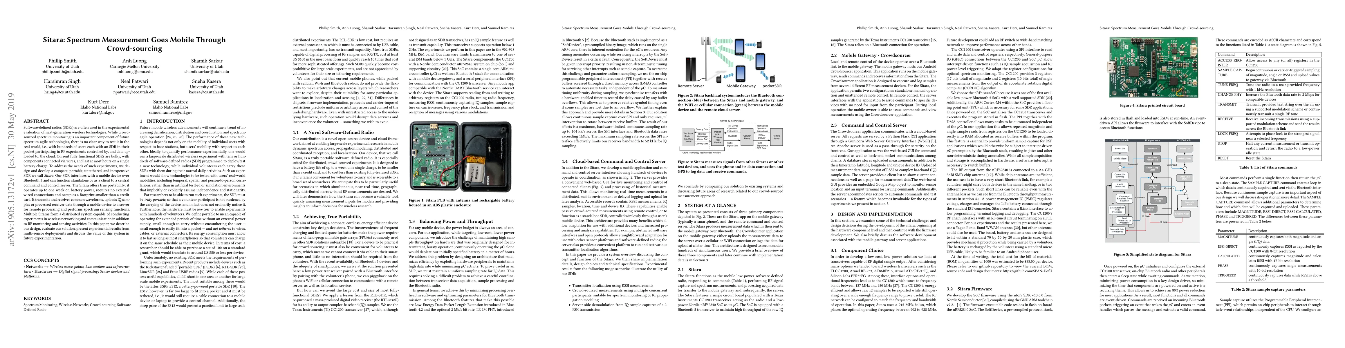 Software-defined radios (SDRs) are often used in the experimental evaluation of next-generation wireless technologies. While crowd-sourced spectrum monitoring is an important component of future spectrum-agile technologies, there is no clear way to test it in the real world, i.e., with hundreds of users each with an SDR in their pocket participating in RF experiments controlled by, and data uploaded to, the cloud. Current fully functional SDRs are bulky, with components connected via wires, and last at most hours on a single battery charge. To address the needs of such experiments, we design and develop a compact, portable, untethered, and inexpensive SDR we call Sitara. Our SDR interfaces with a mobile device over Bluetooth 5 and can function standalone or as a client to a central command and control server. The Sitara offers true portability: it operates up to one week on battery power, requires no external wired connections and occupies a footprint smaller than a credit card. It transmits and receives common waveforms, uploads IQ samples or processed receiver data through a mobile device to a server for remote processing and performs spectrum sensing functions. Multiple Sitaras form a distributed system capable of conducting experiments in wireless networking and communication in addition to RF monitoring and sensing activities. In this paper, we describe our design, evaluate our solution, present experimental results from multi-sensor deployments and discuss the value of this system in future experimentation.