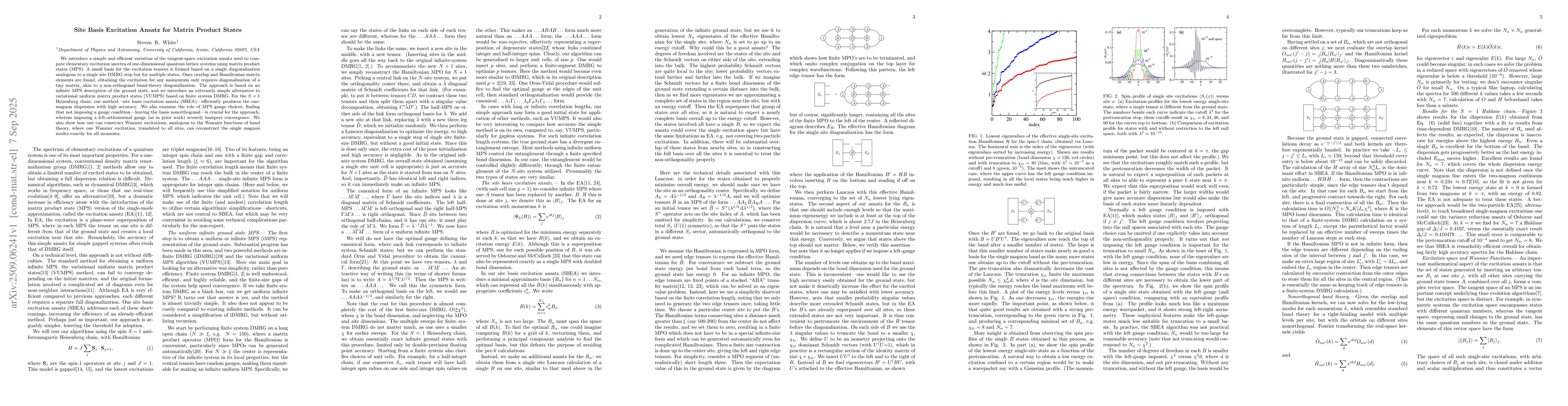 We introduce a simple and efficient variation of the tangent-space excitation ansatz used to compute elementary excitation spectra of one-dimensional quantum lattice systems using matrix product states (MPS). A small basis for the excitation tensors is formed based on a single diagonalization analogous to a single site DMRG step but for multiple states. Once overlap and Hamiltonian matrix elements are found, obtaining the excitation for any momentum only requires diagonalization of a tiny matrix, akin to a non-orthogonal band-theory diagonalization. The approach is based on an infinite MPS description of the ground state, and we introduce an extremely simple alternative to variational uniform matrix product states (VUMPS) based on finite system DMRG. For the $S=1$ Heisenberg chain, our method -- site basis excitation ansatz (SBEA) -- efficiently produces the one-magnon dispersion with high accuracy. We also examine the role of MPS gauge choices, finding that not imposing a gauge condition -- leaving the basis nonorthogonal -- is crucial for the approach, whereas imposing a left-orthonormal gauge (as in prior work) severely hampers convergence. We also show how one can construct Wannier excitations, analogous to the Wannier functions of band theory, where one Wannier excitation, translated to all sites, can reconstruct the single magnon modes exactly for all momenta.
