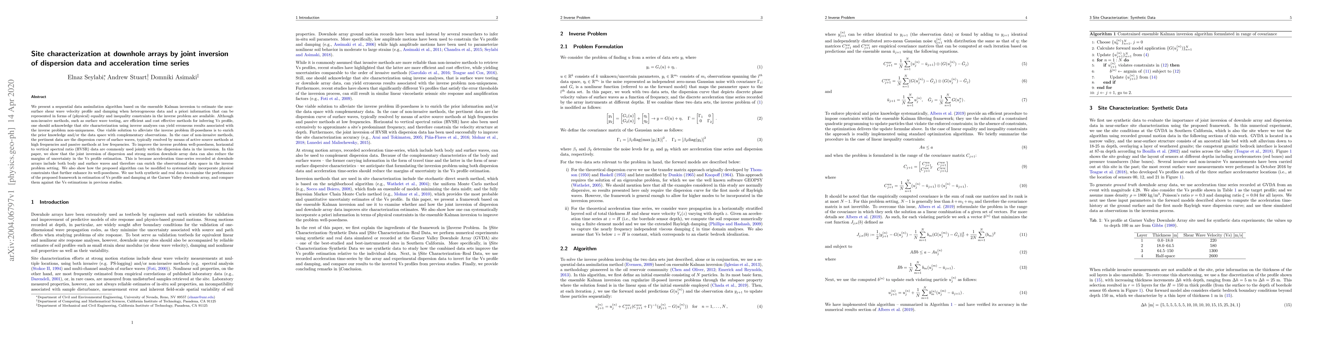 This paper proposes an ensemble Kalman inversion algorithm to estimate near-surface shear wave velocity profiles and damping using joint inversion of dispersion data and acceleration time series from downhole arrays. The method aims to reduce uncertainties in site characterization by incorporating complementary observations and physical constraints.