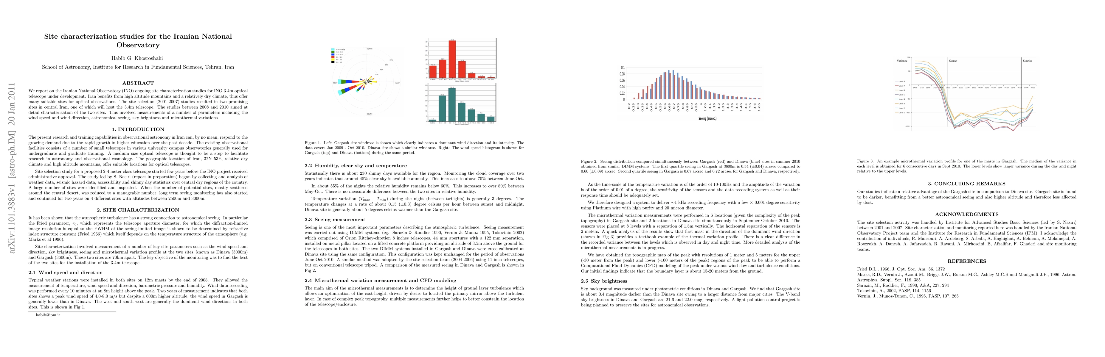 We report on the Iranian National Observatory (INO) ongoing site characterization studies for INO 3.4m optical telescope under development. Iran benefits from high altitude mountains and a relatively dry climate, thus offer many suitable sites for optical observations. The site selection (2001-2007) studies resulted in two promising sites in central Iran, one of which will host the 3.4m telescope. The studies between 2008 and 2010 aimed at detail characterization of the two sites. This involved measurements of a number of parameters including the wind speed and wind direction, astronomical seeing, sky brightness and microthermal variations.