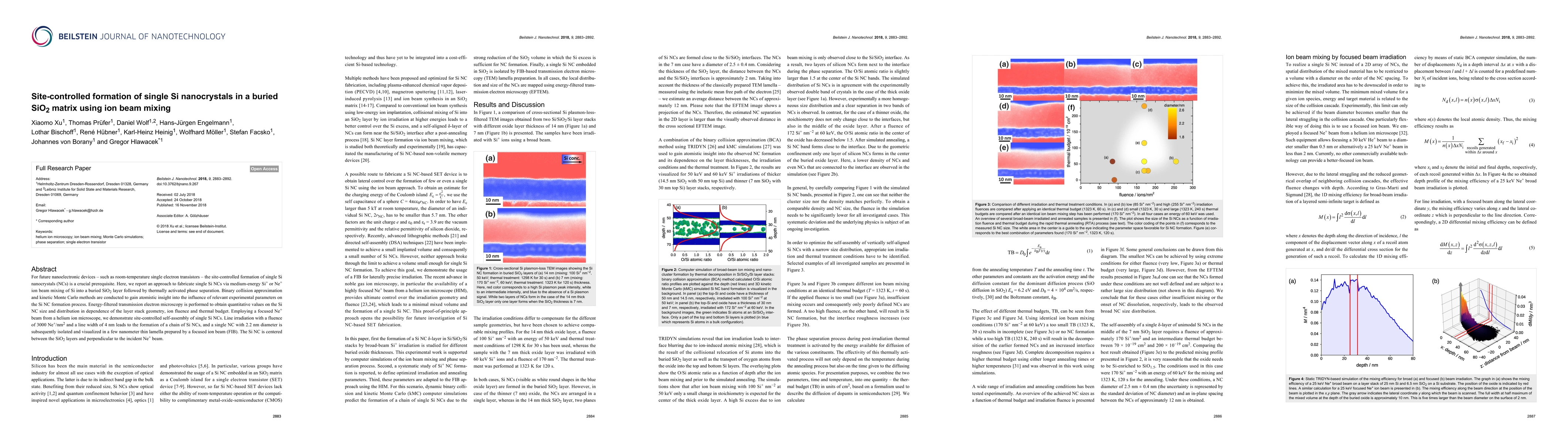 This paper presents a method for site-controlled formation of single Si nanocrystals in a buried SiO2 matrix using ion beam mixing, crucial for future nanoelectronic devices. The study employs medium-energy Si+ or Ne+ ion beam mixing followed by thermal phase separation, with atomistic insights gained through simulation and microscopy to control nanocrystal size and distribution.