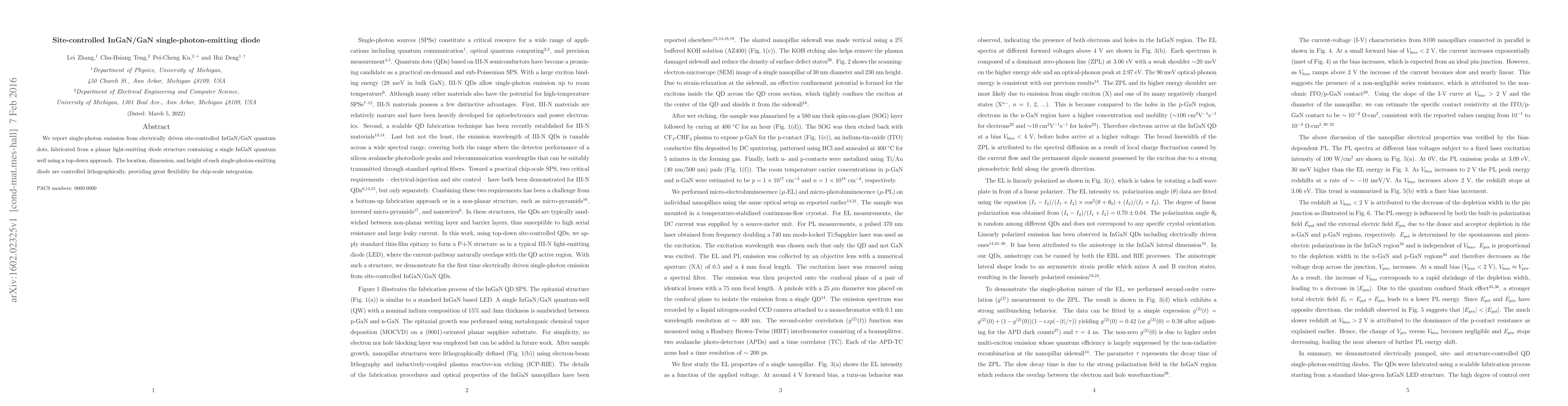 The paper presents a novel approach to fabricate site-controlled InGaN/GaN single-photon emitting diodes using a planar LED structure, enabling lithographic control over the qdots' location, dimension, and height.
