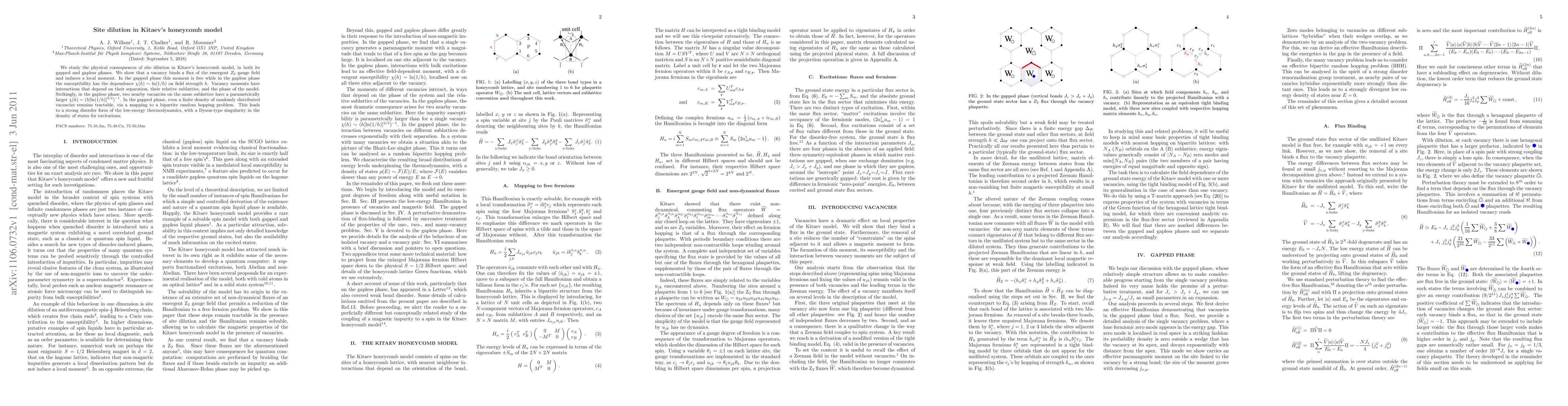 We study the physical consequences of site dilution in Kitaev's honeycomb model, in both its gapped and gapless phases. We show that a vacancy binds a flux of the emergent $Z_2$ gauge field and induces a local moment. In the gapped phase this moment is free while in the gapless phase the susceptibility has the dependence $\chi(h)\sim\ln(1/h)$ on field strength $h$. Vacancy moments have interactions that depend on their separation, their relative sublattice, and the phase of the model. Strikingly, in the gapless phase, two nearby vacancies on the same sublattice have a parametrically larger $\chi(h)\sim(h[\ln(1/h)]^{3/2})^{-1}$. In the gapped phase, even a finite density of randomly distributed vacancies remains tractable, via a mapping to a bipartite random hopping problem. This leads to a strong disorder form of the low-energy thermodynamics, with a Dyson-type singularity in the density of states for excitations.
