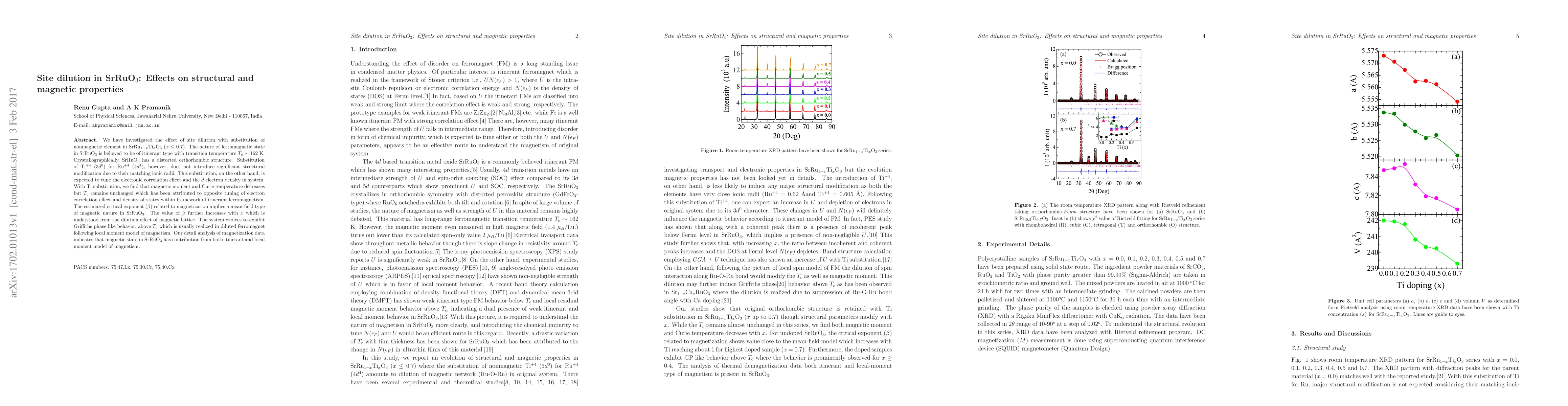 This study investigates the impact of site dilution through Ti substitution in SrRu$_{1-x}$Ti$_x$O$_3$ on the structural and magnetic properties of SrRuO$_3$. The substitution decreases the magnetic moment and Curie temperature but leaves the transition temperature unchanged, indicating a complex interplay between electron correlation and density of states.