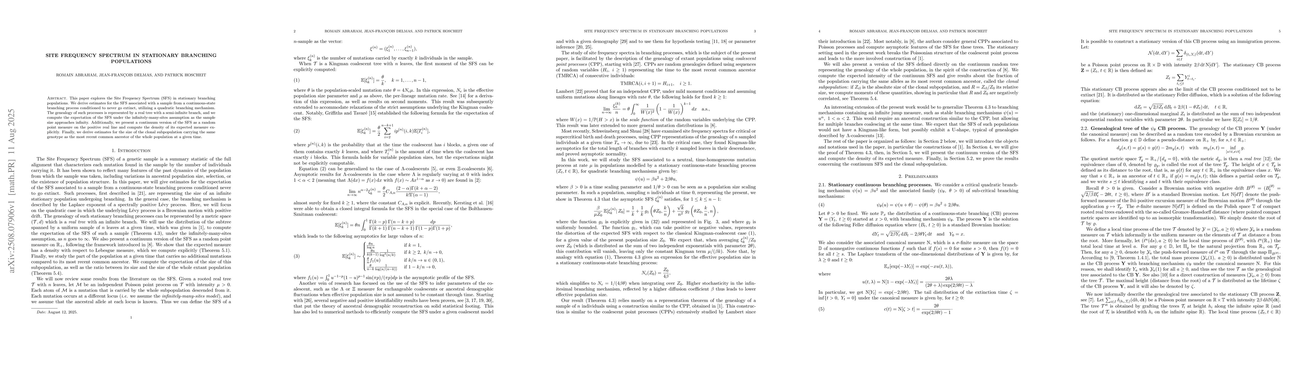 This paper explores the Site Frequency Spectrum (SFS) in stationary branching populations. We derive estimates for the SFS associated with a sample from a continuous-state branching process conditioned to never go extinct, utilizing a quadratic branching mechanism. The genealogy of such processes is represented by a real tree with a semi-infinite branch, and we compute the expectation of the SFS under the infinitely-many-sites assumption as the sample size approaches infinity. Additionally, we present a continuum version of the SFS as a random point measure on the positive real line and compute the density of its expected measure explicitly. Finally, we derive estimates for the size of the clonal subpopulation carrying the same genotype as the most recent common ancestor of the whole population at a given time.