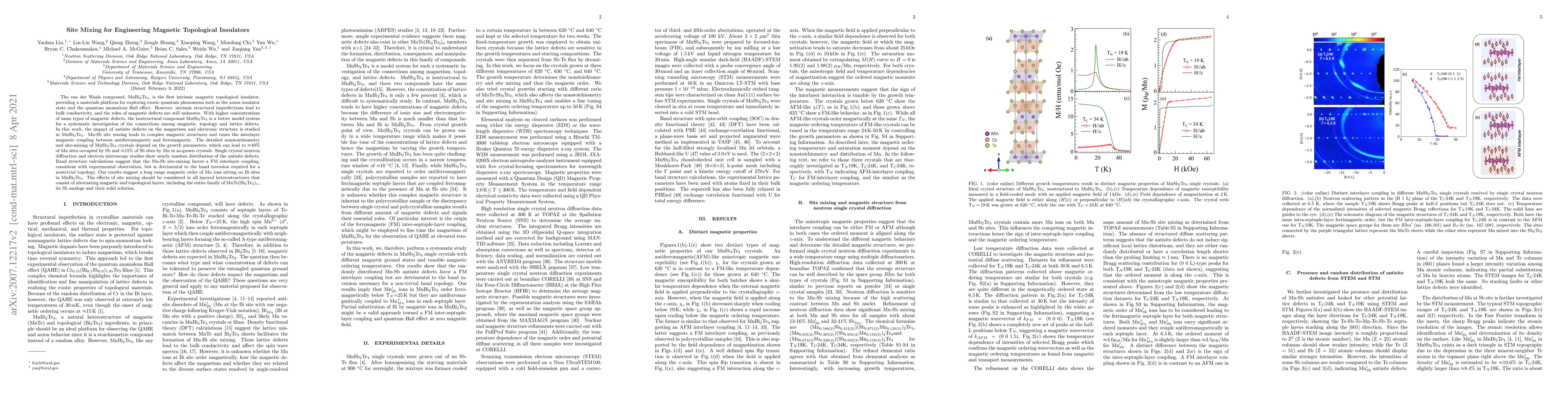Researchers investigate how defects in a type of magnetic material called MnSb2Te4 affect its behavior, finding that site mixing between manganese and antimony can lead to complex magnetic structures and tune interlayer coupling, but is detrimental to the material's topological properties.
