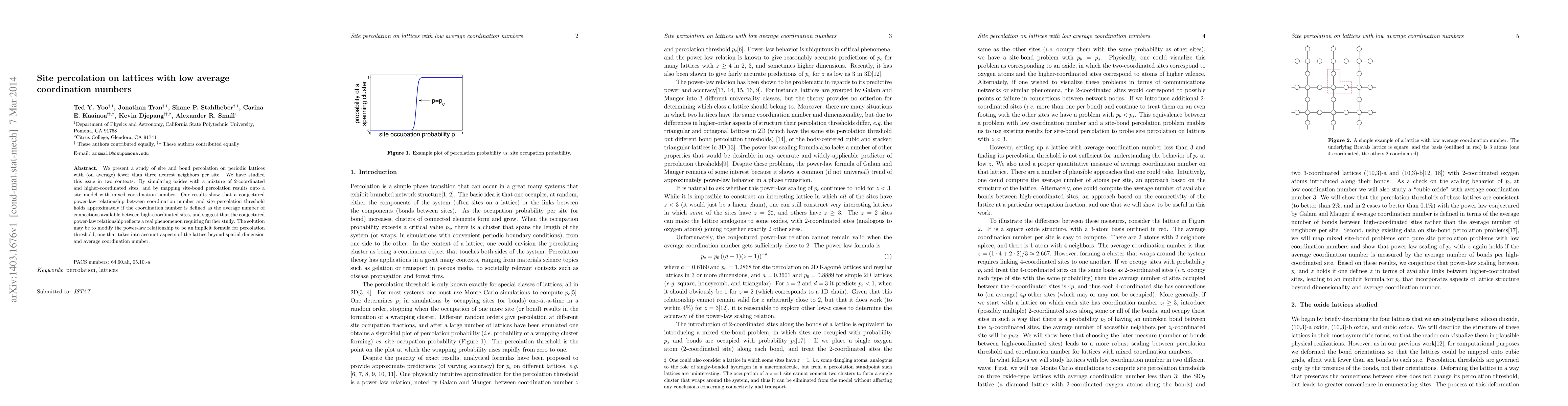 We present a study of site and bond percolation on periodic lattices with (on average) fewer than three nearest neighbors per site. We have studied this issue in two contexts: By simulating oxides with a mixture of 2-coordinated and higher-coordinated sites, and by mapping site-bond percolation results onto a site model with mixed coordination number. Our results show that a conjectured power-law relationship between coordination number and site percolation threshold holds approximately if the coordination number is defined as the average number of connections available between high-coordinated sites, and suggest that the conjectured power-law relationship reflects a real phenomenon requiring further study. The solution may be to modify the power-law relationship to be an implicit formula for percolation threshold, one that takes into account aspects of the lattice beyond spatial dimension and average coordination number.