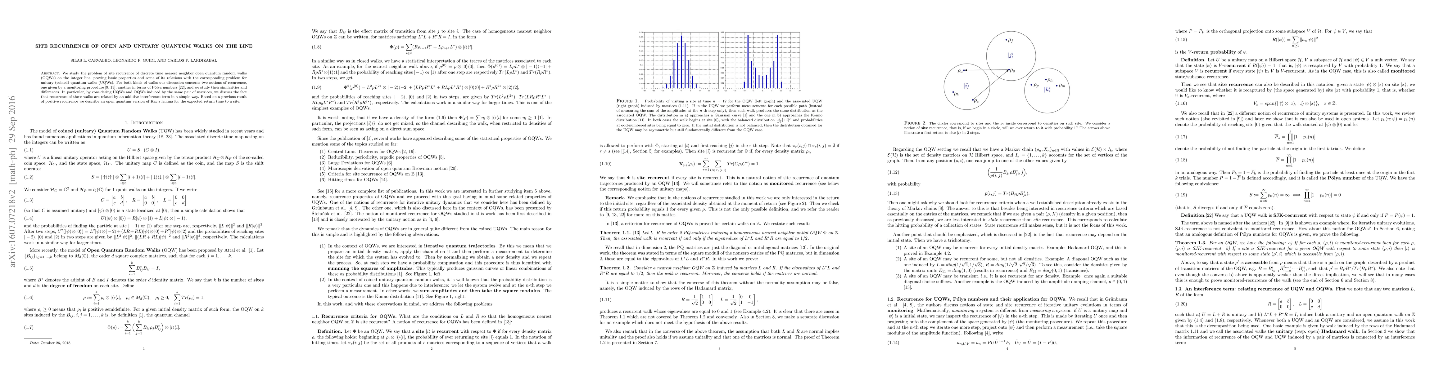 We study the problem of site recurrence of discrete time nearest neighbor open quantum random walks (OQWs) on the integer line, proving basic properties and some of its relations with the corresponding problem for unitary (coined) quantum walks (UQWs). For both kinds of walks our discussion concerns two notions of recurrence, one given by a monitoring procedure, another in terms of P\'olya numbers, and we study their similarities and differences. In particular, by considering UQWs and OQWs induced by the same pair of matrices, we discuss the fact that recurrence of these walks are related by an additive interference term in a simple way. Based on a previous result of positive recurrence we describe an open quantum version of Kac's lemma for the expected return time to a site.