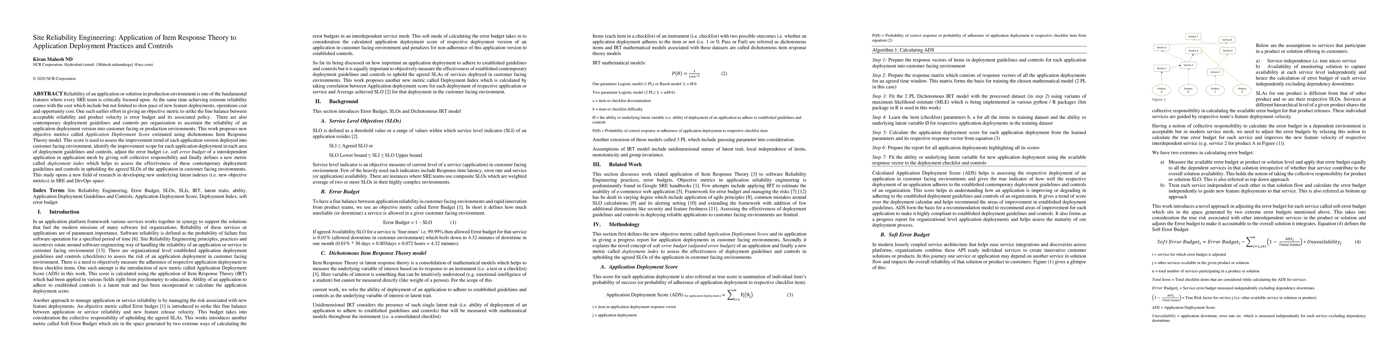 Reliability of an application or solution in production environment is one of the fundamental features where every SRE team is critically focused upon. At the same time achieving extreme reliability comes with the cost which include but not limited to slow pace of new feature deployments, operations cost and opportunity cost. One such earlier effort in giving an objective metric to strike the fine balance between acceptable reliability and product velocity is error budget and its associated policy. There are also contemporary deployment guidelines and controls per organization to ascertain the reliability of an application deployment version into customer facing or production environments. This work proposes new objective metrics called Application Deployment Score estimated using dichotomous Item Response Theory model. This score is used to assess the improvement trend of each application version deployed into customer facing environment, identify the improvement scope for each application deployment in each area of deployment guidelines and controls, adjust the error budget i.e. soft error budget of a interdependent application in application mesh by giving soft collective responsibility and finally defines a new metric called deployment index which helps to assess the effectiveness of these contemporary deployment guidelines and controls in upholding the agreed SLOs of the application in customer facing environments. This study opens a new field of research in developing new underlying latent indexes (i.e. new objective metrics) in SRE and DevOps space.