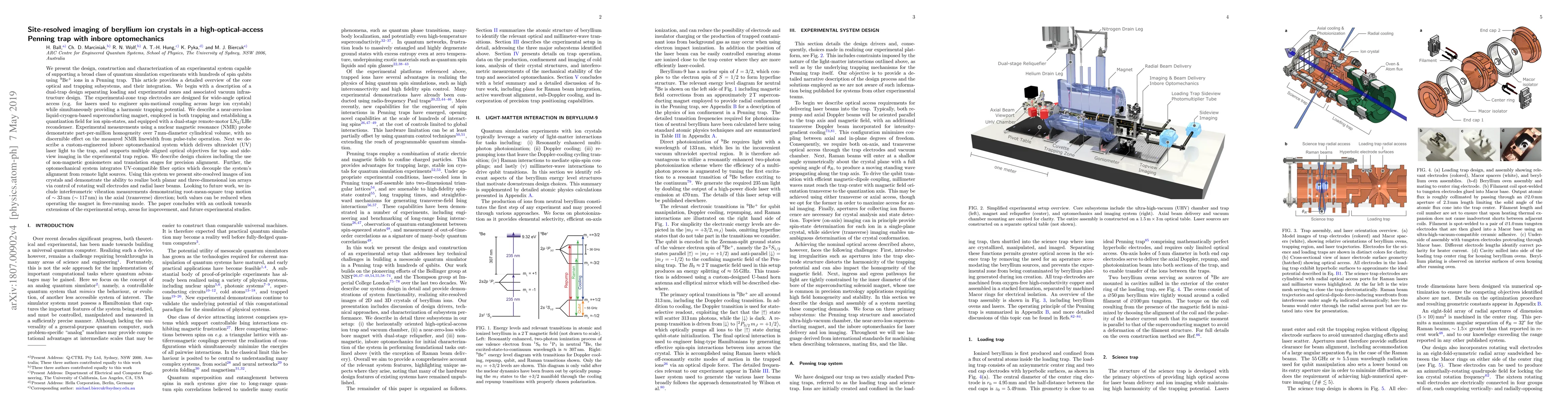 We present the design, construction and characterization of an experimental system capable of supporting a broad class of quantum simulation experiments with hundreds of spin qubits using Be-9 ions in a Penning trap. This article provides a detailed overview of the core optical and trapping subsystems, and their integration. We begin with a description of a dual-trap design separating loading and experimental zones and associated vacuum infrastructure design. The experimental-zone trap electrodes are designed for wide-angle optical access (e.g. for lasers used to engineer spin-motional coupling across large ion crystals) while simultaneously providing a harmonic trapping potential. We describe a near-zero-loss liquid-cryogen-based superconducting magnet, employed in both trapping and establishing a quantization field for ion spin-states, and equipped with a dual-stage remote-motor LN2LHe recondenser. Experimental measurements using a nuclear magnetic resonance (NMR) probe demonstrate part-per-million homogeneity over 7 mm-diameter cylindrical volume, with no discernible effect on the measured NMR linewidth from pulse-tube operation. Next we describe a custom-engineered inbore optomechanical system which delivers ultraviolet (UV) laser light to the trap, and supports multiple aligned optical objectives for top- and sideview imaging in the experimental trap region. We describe design choices including the use of non-magnetic goniometers and translation stages for precision alignment. Further, the optomechanical system integrates UV-compatible fiber optics which decouple the system's alignment from remote light sources. Using this system we present site-resolved images of ion crystals and demonstrate the ability to realize both planar and three-dimensional ion arrays via control of rotating wall electrodes and radial laser beams. Looking to future work, we include interferometric..