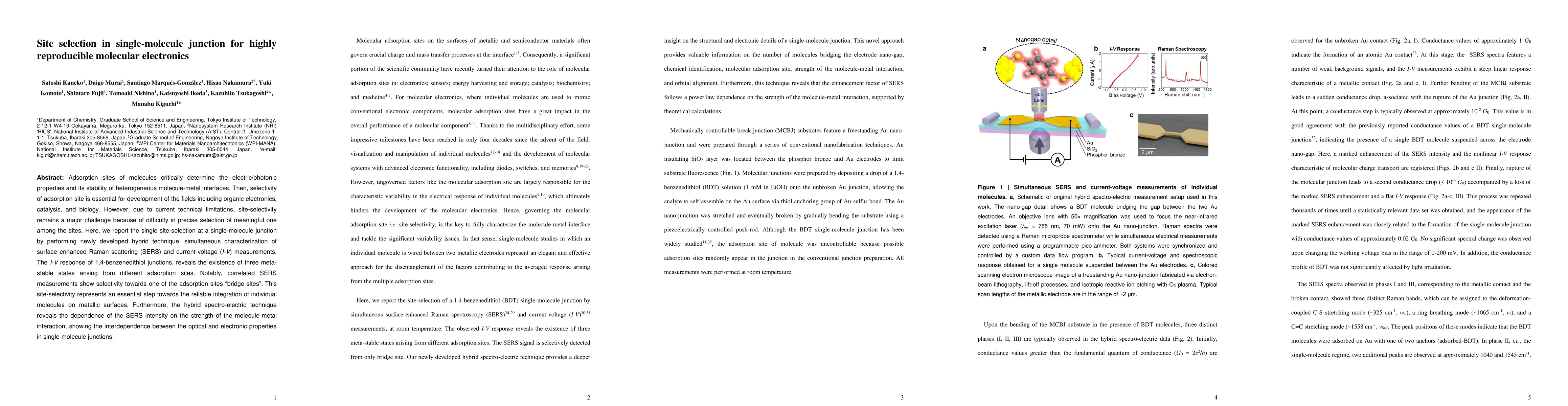 Adsorption sites of molecules critically determine the electric/photonic properties and its stability of heterogeneous molecule-metal interfaces. Then, selectivity of adsorption site is essential for development of the fields including organic electronics, catalysis, and biology. However, due to current technical limitations, site-selectivity remains a major challenge because of difficulty in precise selection of meaningful one among the sites. Here, we report the single site-selection at a single-molecule junction by performing newly developed hybrid technique: simultaneous characterization of surface enhanced Raman scattering (SERS) and current-voltage (I-V) measurements. The I-V response of 1,4-benzenedithiol junctions, reveals the existence of three meta-stable states arising from different adsorption sites. Notably, correlated SERS measurements show selectivity towards one of the adsorption sites, bridge sites. This site-selectivity represents an essential step towards the reliable integration of individual molecules on metallic surfaces. Furthermore, the hybrid spectro-electric technique reveals the dependence of the SERS intensity on the strength of the molecule-metal interaction, showing the interdependence between the optical and electronic properties in single-molecule junctions.