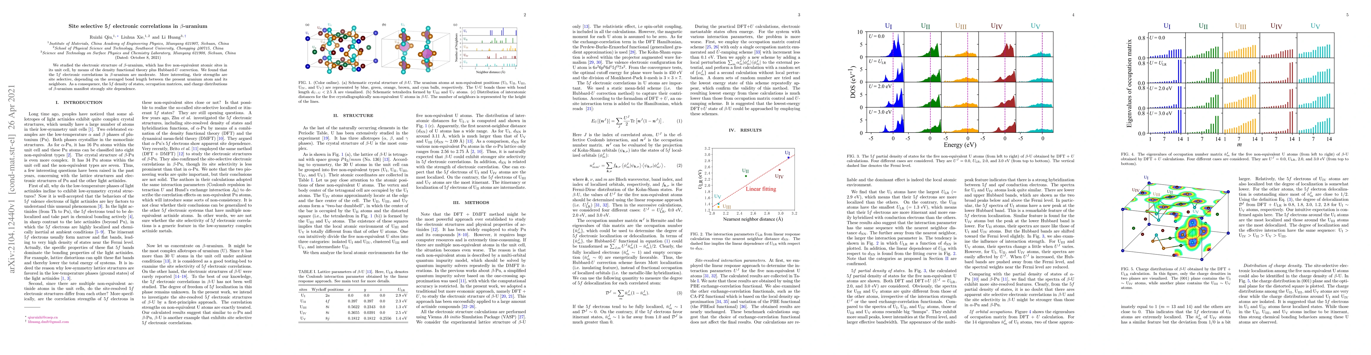 Research on beta-uranium reveals site-selective 5f electronic correlations that vary with averaged bond length, leading to site-dependent density of states, occupation matrices, and charge distributions.