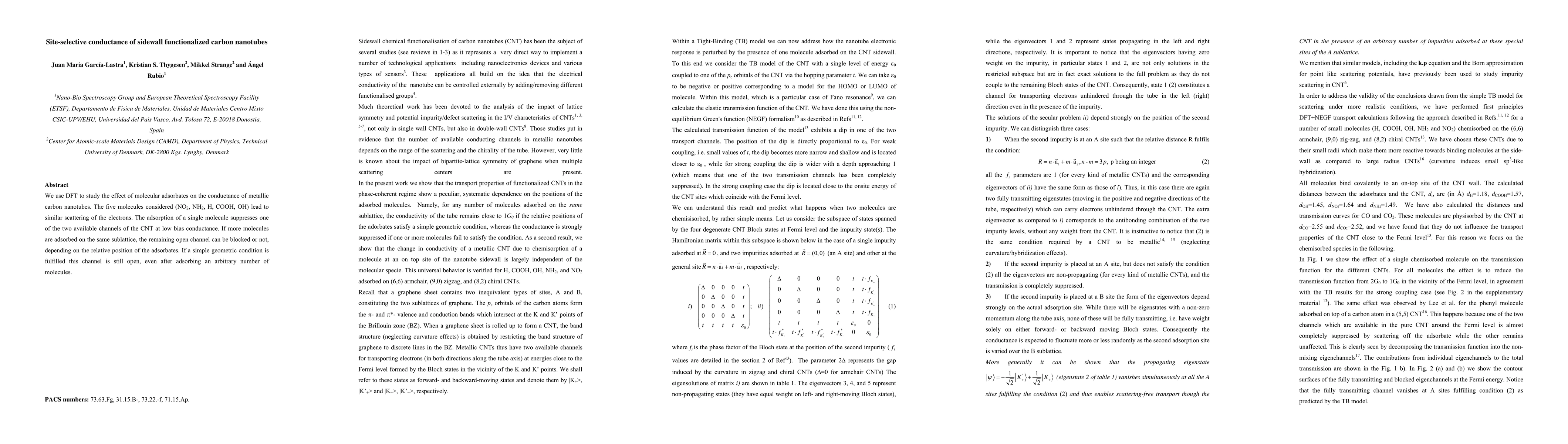We use DFT to study the effect of molecular adsorbates on the conductance of metallic carbon nanotubes. The five molecules considered (NO2, NH2, H, COOH, OH) lead to similar scattering of the electrons. The adsorption of a single molecule suppresses one of the two available channels of the CNT at low bias conductance. If more molecules are adsorbed on the same sublattice, the remaining open channel can be blocked or not, depending on the relative position of the adsorbates. If a simple geometric condition is fulfilled this channel is still open, even after adsorbing an arbitrary number of molecules.