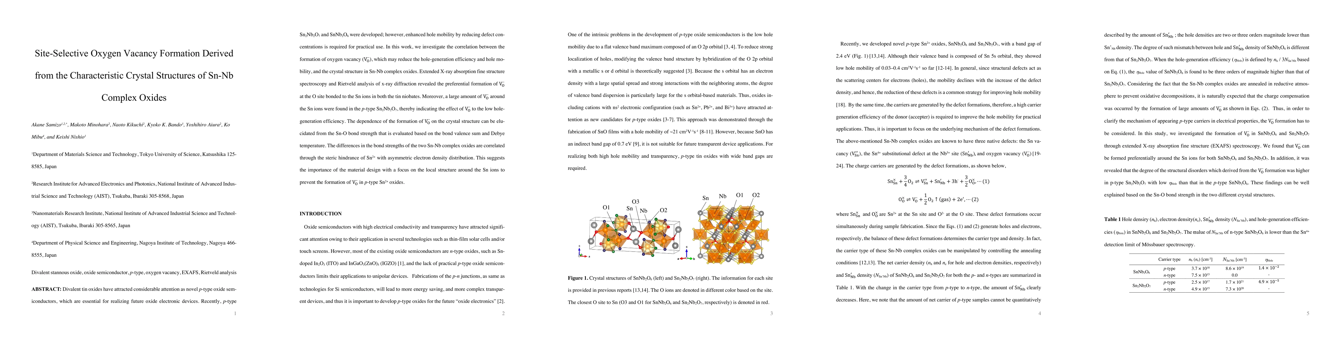 This research investigates the correlation between oxygen vacancy formation and crystal structure in Sn-Nb complex oxides, crucial for enhancing hole mobility in p-type semiconductors. Utilizing Extended X-ray absorption fine structure spectroscopy and Rietveld analysis, the study reveals preferential oxygen vacancy formation at Sn-bonded O sites, with higher vacancy concentrations linked to lower hole-generation efficiency in Sn2Nb2O7. The findings emphasize the significance of material design focusing on Sn ion local structures to minimize oxygen vacancy formation for improved p-type Sn2+ oxide semiconductor performance.