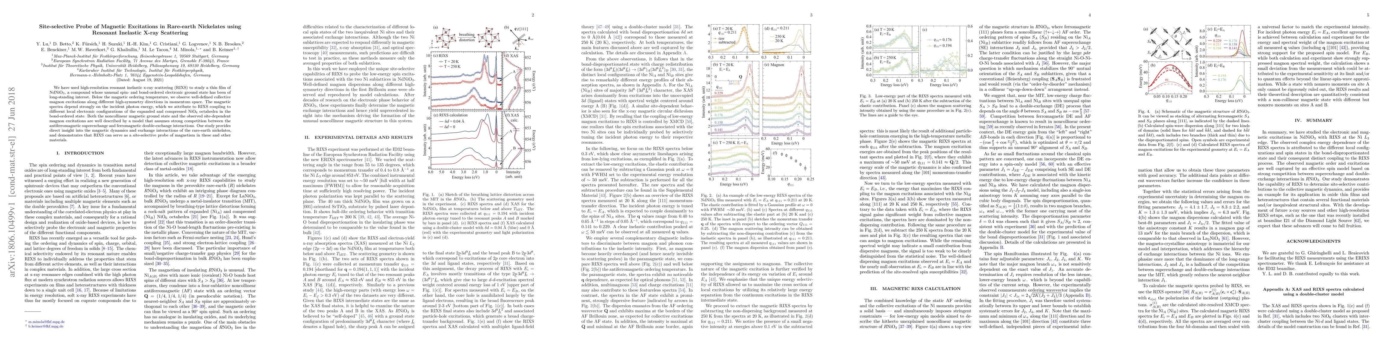 We have used high-resolution resonant inelastic x-ray scattering (RIXS) to study a thin film of NdNiO$_3$, a compound whose unusual spin- and bond-ordered electronic ground state has been of long-standing interest. Below the magnetic ordering temperature, we observe well-defined collective magnon excitations along different high-symmetry directions in momentum space. The magnetic spectra depend strongly on the incident photon energy, which we attribute to RIXS coupling to different local electronic configurations of the expanded and compressed NiO$_6$ octahedra in the bond-ordered state. Both the noncollinear magnetic ground state and the observed site-dependent magnon excitations are well described by a model that assumes strong competition between the antiferromagnetic superexchange and ferromagnetic double-exchange interactions. Our study provides direct insight into the magnetic dynamics and exchange interactions of the rare-earth nickelates, and demonstrates that RIXS can serve as a site-selective probe of magnetism in these and other materials.