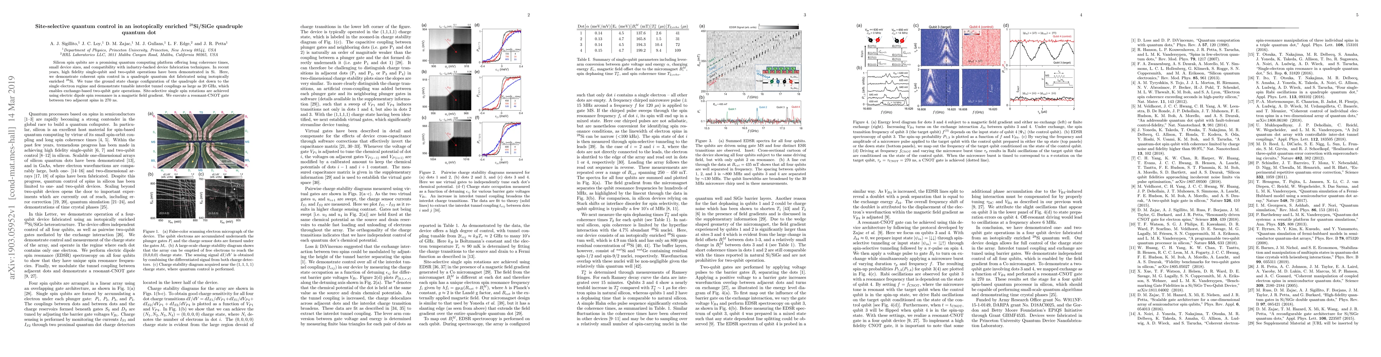 This paper demonstrates coherent spin control in an isotopically enriched 28Si quadruple quantum dot, achieving site-selective single spin rotations and a resonant-CNOT gate in 270 ns, showcasing potential for scalable silicon-based quantum computing.