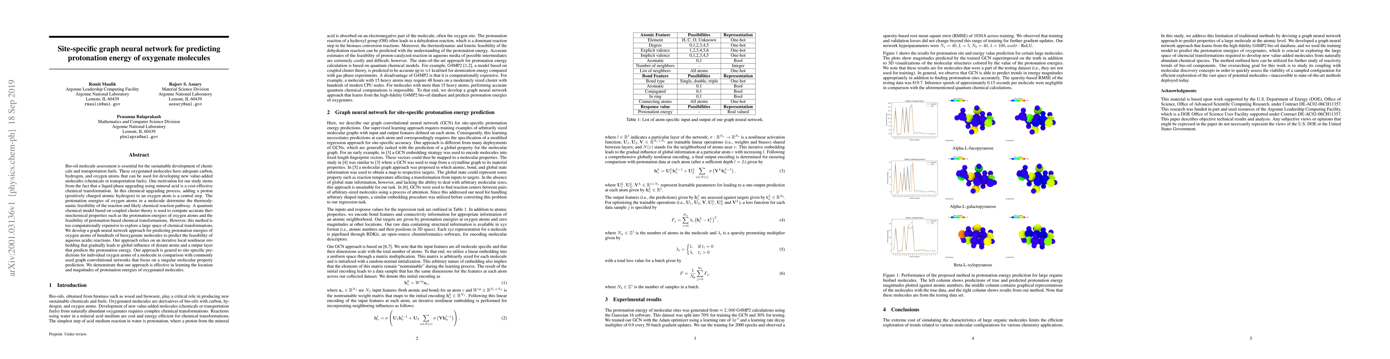 This paper proposes a site-specific graph neural network to predict protonation energies of oxygen atoms in oxygenated molecules, enabling cost-effective chemical transformations in bio-oil upgrading. The model uses an iterative local embedding to capture global molecular influences, achieving accurate site-specific predictions compared to traditional graph convolutional networks.