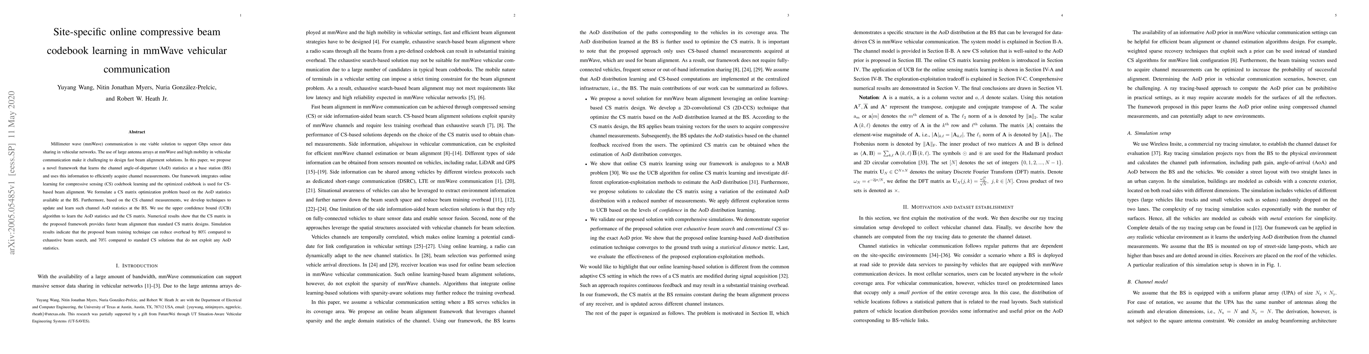 This paper proposes a novel framework for fast beam alignment in mmWave vehicular communication by learning site-specific channel angle-of-departure (AoD) statistics at a base station using online compressive sensing codebook learning. The framework reduces beam training overhead by 80% compared to exhaustive search and 70% compared to standard CS solutions.