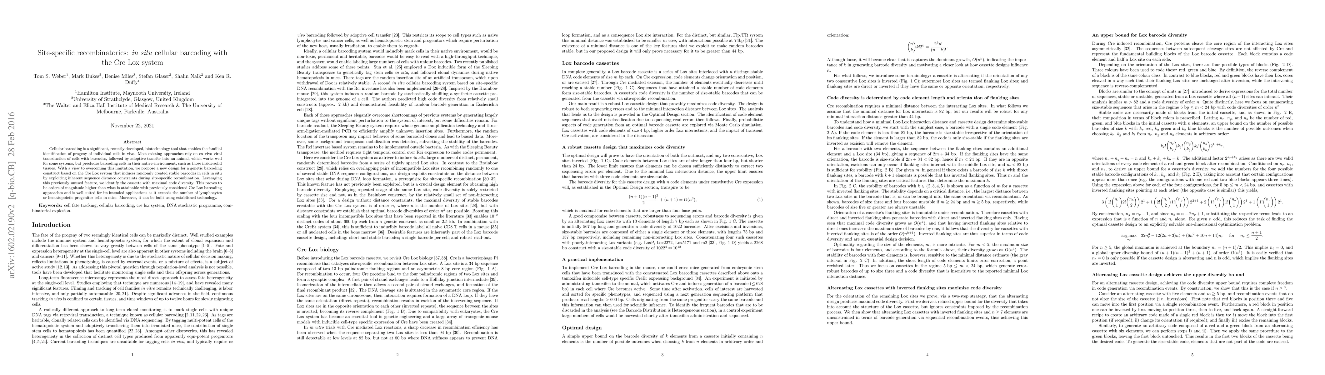 Cellular barcoding is a significant, recently developed, biotechnology tool that enables the familial identification of progeny of individual cells in vivo. Most existing approaches rely on ex vivo viral transduction of cells with barcodes, followed by adoptive transfer into an animal, which works well for some systems, but precludes barcoding cells in their native environment, such as those inside solid tissues. With a view to overcoming this limitation, we propose a new design for a genetic barcoding construct based on the Cre Lox system that induces randomly created stable barcodes in cells in situ by exploiting inherent sequence distance constraints during site-specific recombination. Leveraging this previously unused feature, we identify the cassette with maximal code diversity. This proves to be orders of magnitude higher than what is attainable with previously considered Cre Lox barcoding approaches and is well suited for its intended applications as it exceeds the number of lymphocytes or hematopoietic progenitor cells in mice. Moreover, it can be built using established technology.