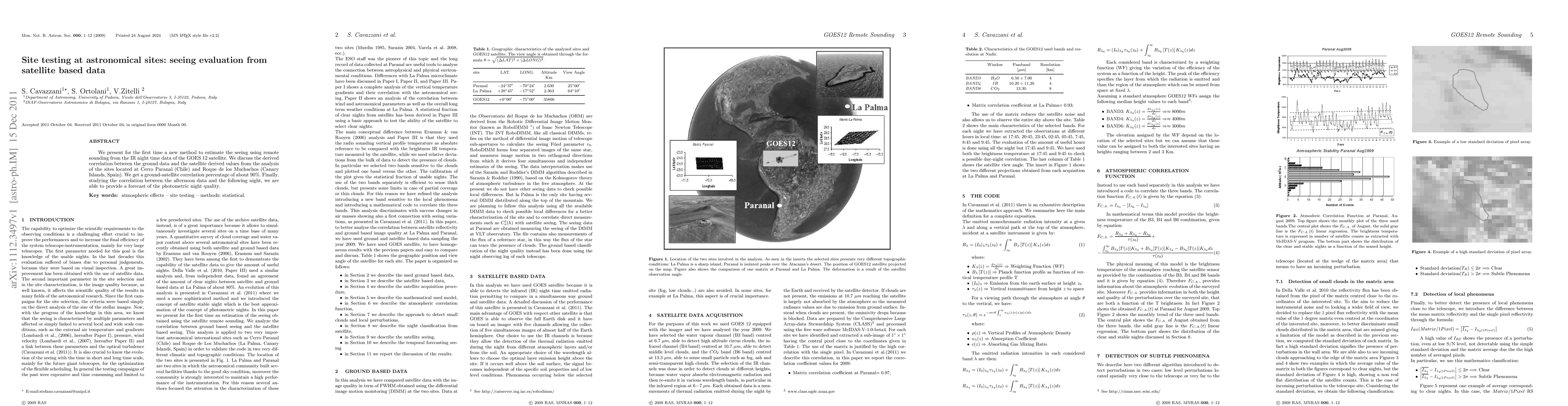 This paper introduces a novel method to estimate astronomical seeing using IR night data from the GOES 12 satellite, achieving a 90% correlation with ground observations at Cerro Paranal and Roque de los Muchachos. The study also forecasts photometric night quality based on afternoon data correlations.