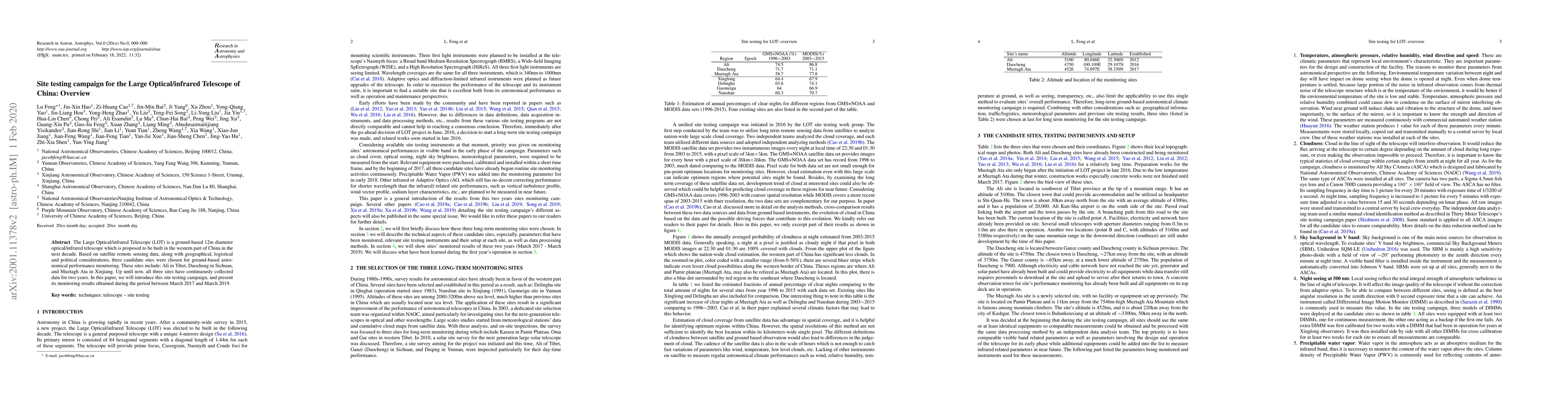 The Large Optical/infrared Telescope (LOT) is a ground-based 12m diameter optical/infrared telescope which is proposed to be built in the western part of China in the next decade. Based on satellite remote sensing data, along with geographical, logistical and political considerations, three candidate sites were chosen for ground-based astronomical performance monitoring. These sites include: Ali in Tibet, Daocheng in Sichuan, and Muztagh Ata in Xinjiang. Up until now, all three sites have continuously collected data for two years. In this paper, we will introduce this site testing campaign, and present its monitoring results obtained during the period between March 2017 and March 2019.