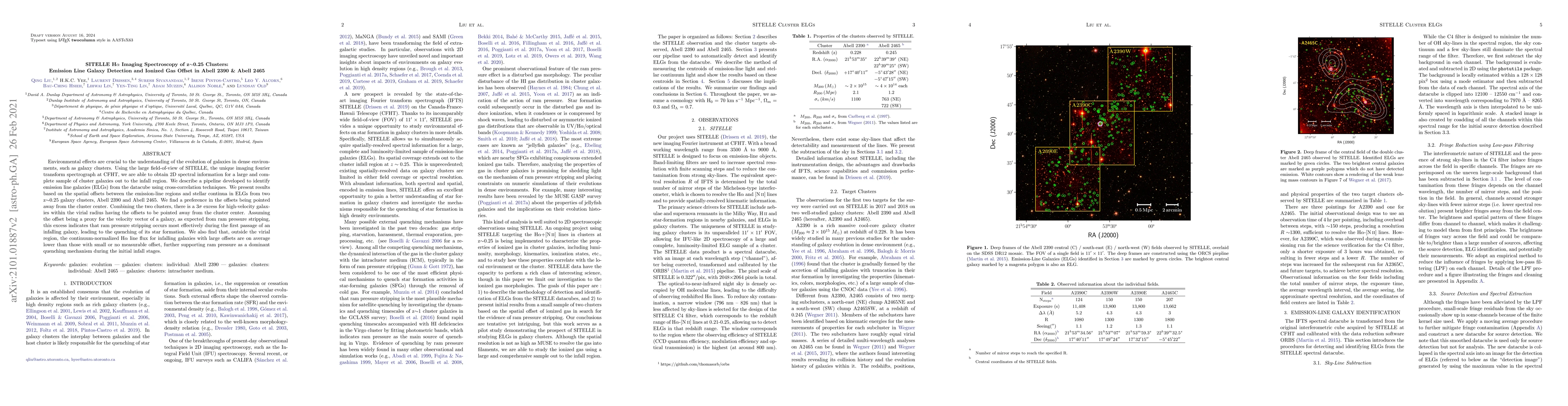 Researchers used SITELLE imaging spectroscopy to study galaxy clusters at z~0.25, finding that galaxies with large offsets from the cluster center tend to have lower H$eta$ line fluxes and are more likely to be stripped of their star-forming gas by ram pressure.