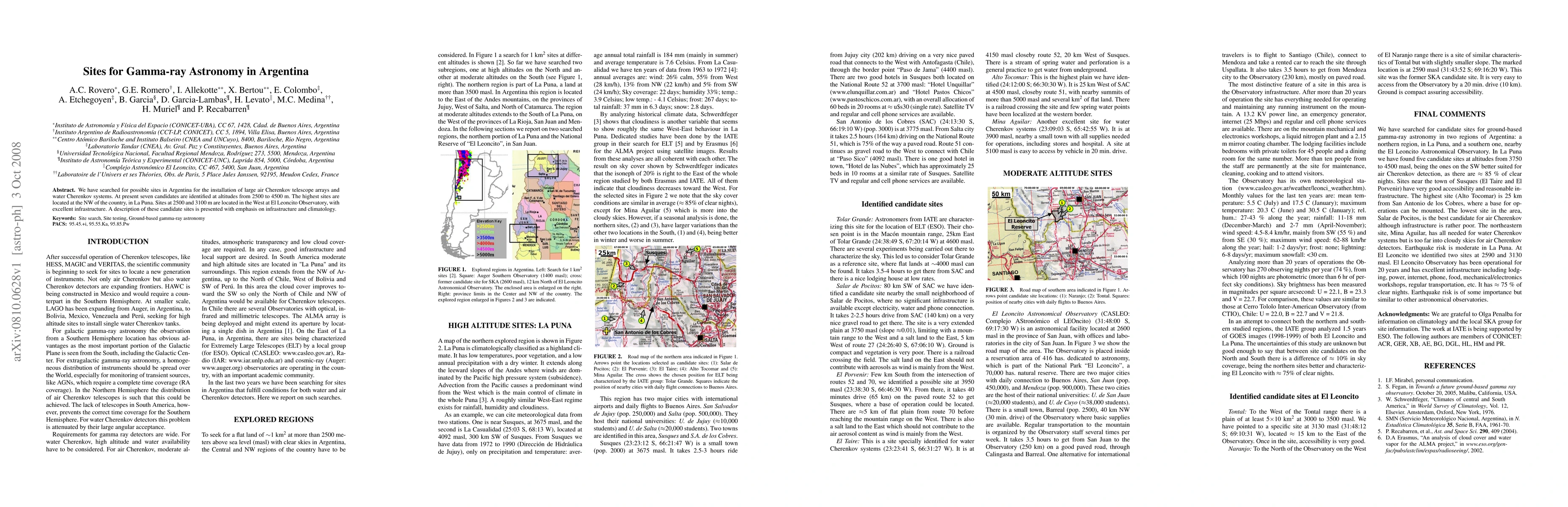 This paper identifies seven potential sites in Argentina for large air Cherenkov telescope arrays and water Cherenkov systems, ranging from 2500 to 4500 m altitude, with a focus on the highest sites in La Puna and infrastructure-rich locations at El Leoncito Observatory. The study emphasizes site infrastructure and climatology for optimal gamma-ray astronomy.