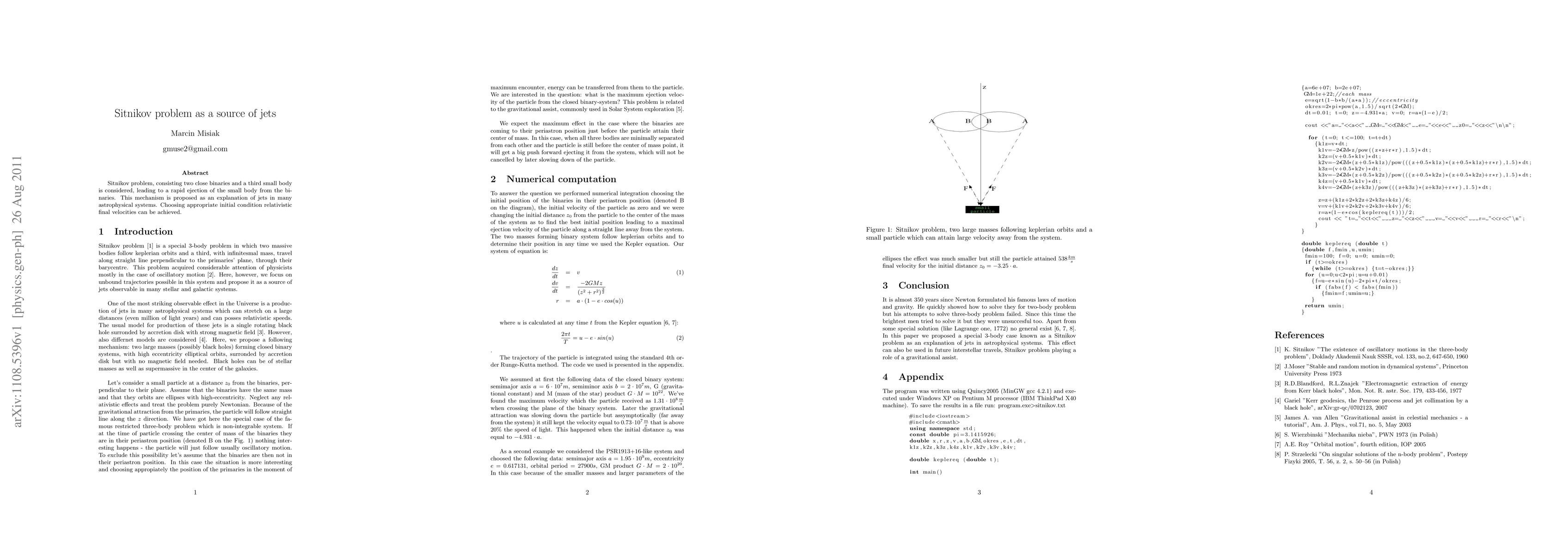 Sitnikov problem, consisting two close binaries and a third small body is considered, leading to a rapid ejection of the small body from the binaries. This mechanism is proposed as an explanation of jets in many astrophysical systems. Choosing appropriate initial condition relativistic final velocities can be achieved.
