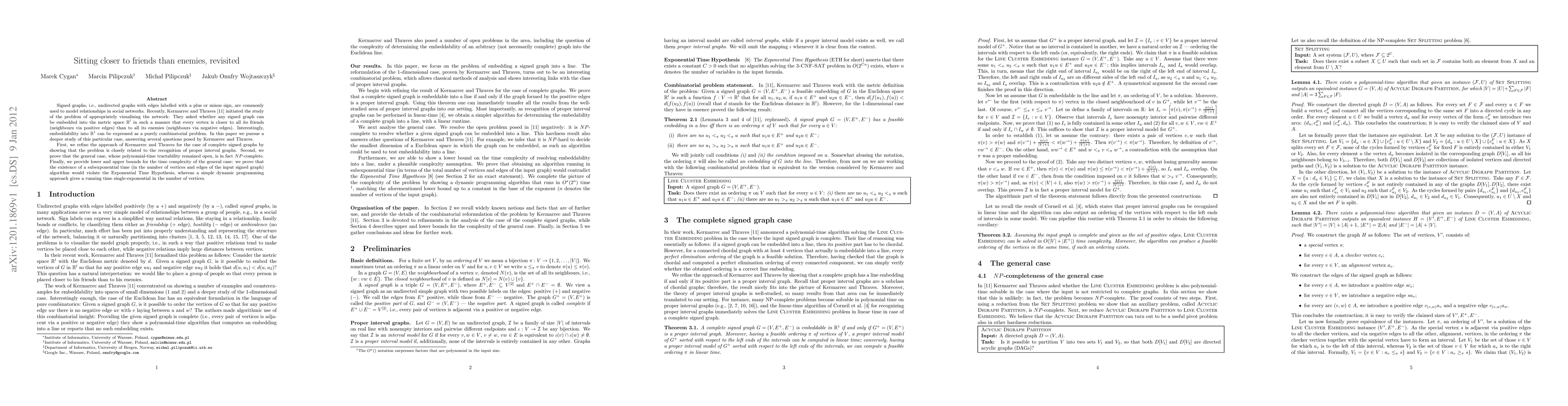Signed graphs, i.e., undirected graphs with edges labelled with a plus or minus sign, are commonly used to model relationships in social networks. Recently, Kermarrec and Thraves initiated the study of the problem of appropriately visualising the network: They asked whether any signed graph can be embedded into the metric space R^l in such a manner that every vertex is closer to all its friends (neighbours via positive edges) than to all its enemies (neighbours via negative edges). Interestingly, embeddability into R^1 can be expressed as a purely combinatorial problem. In this paper we pursue a deeper study of this particular case, answering several questions posed by Kermarrec and Thraves. First, we refine the approach of Kermarrec and Thraves for the case of complete signed graphs by showing that the problem is closely related to the recognition of proper interval graphs. Second, we prove that the general case, whose polynomial-time tractability remained open, is in fact NP-complete. Finally, we provide lower and upper bounds for the time complexity of the general case: we prove that the existence of a subexponential time (in the number of vertices and edges of the input signed graph) algorithm would violate the Exponential Time Hypothesis, whereas a simple dynamic programming approach gives a running time single-exponential in the number of vertices.