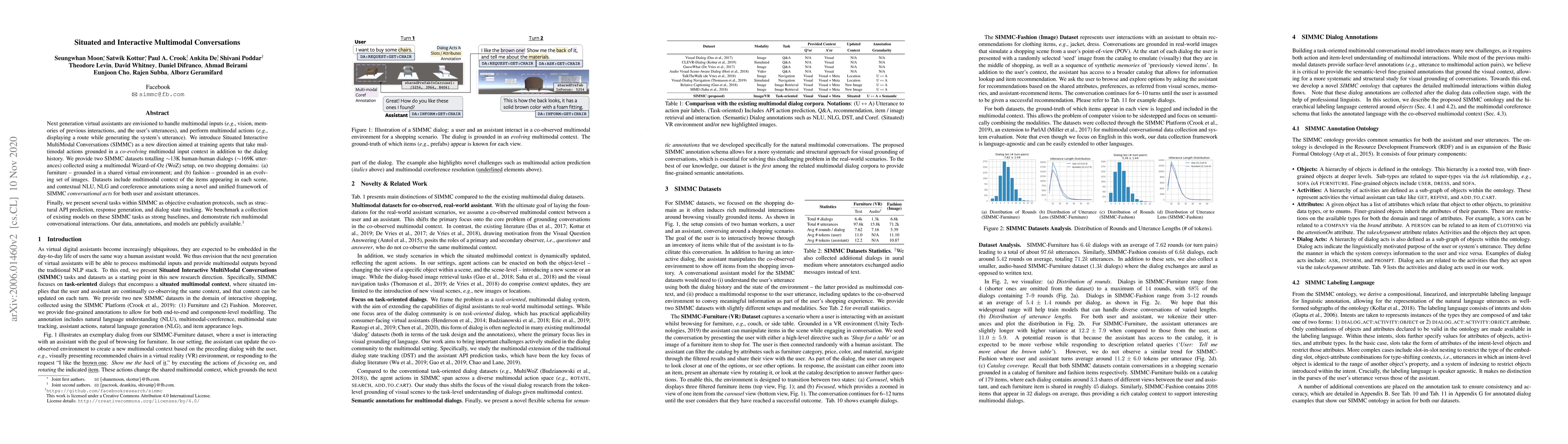 This paper introduces Situated Interactive MultiModal Conversations (SIMMC) to train virtual assistants capable of handling and generating multimodal inputs and actions. The authors provide two large datasets and a unified framework for multimodal conversational acts, along with evaluation tasks and benchmarks for existing models, all of which are publicly available.