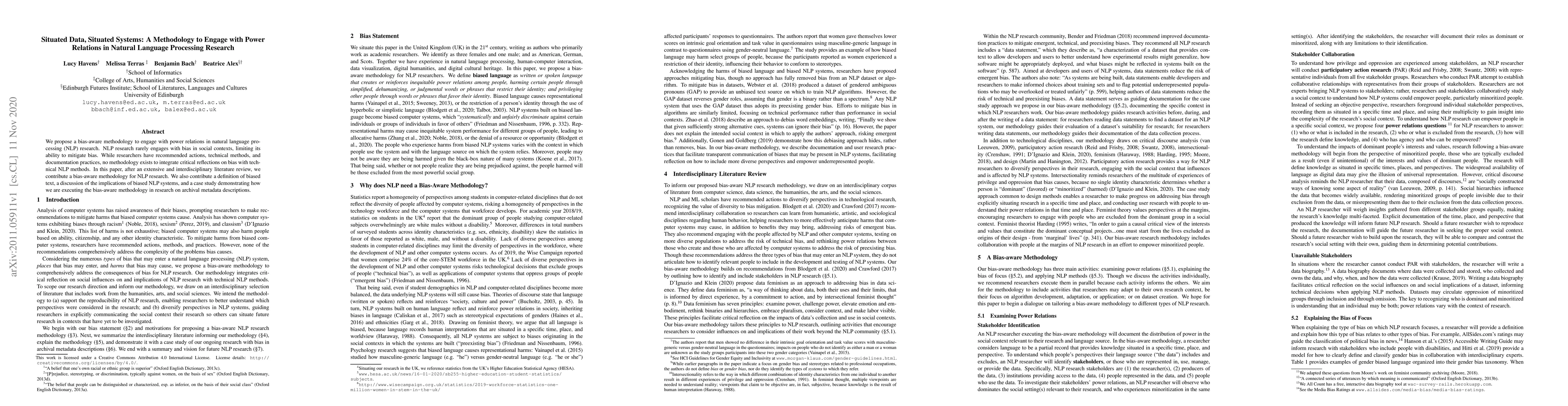 This paper introduces a bias-aware methodology to address power relations in NLP research, emphasizing the need for integrating critical reflections on bias with technical NLP methods. It also provides a definition of biased text and demonstrates its application through a case study on archival metadata descriptions.
