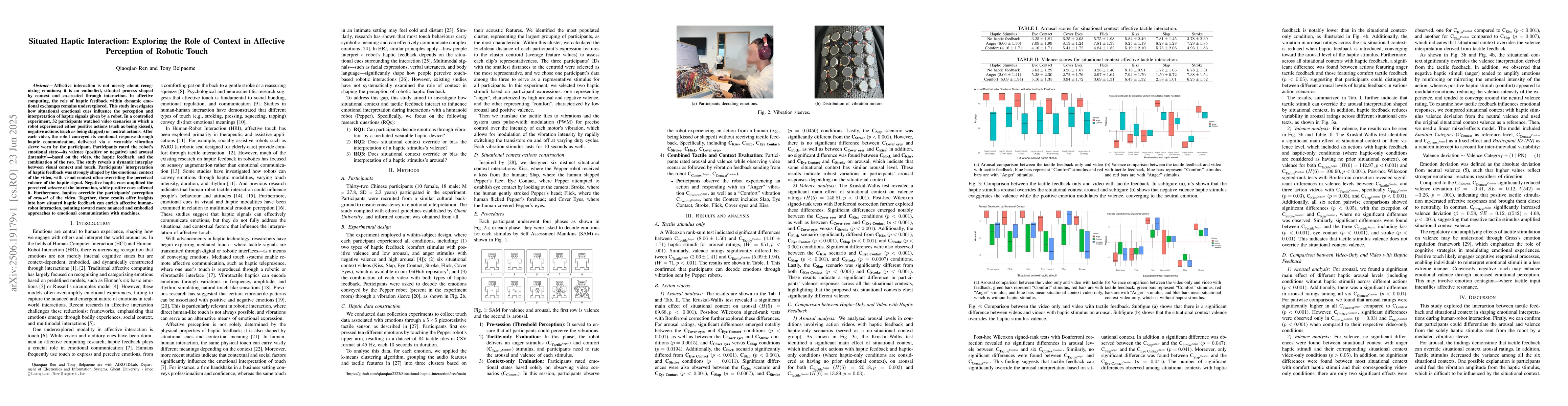 Affective interaction is not merely about recognizing emotions; it is an embodied, situated process shaped by context and co-created through interaction. In affective computing, the role of haptic feedback within dynamic emotional exchanges remains underexplored. This study investigates how situational emotional cues influence the perception and interpretation of haptic signals given by a robot. In a controlled experiment, 32 participants watched video scenarios in which a robot experienced either positive actions (such as being kissed), negative actions (such as being slapped) or neutral actions. After each video, the robot conveyed its emotional response through haptic communication, delivered via a wearable vibration sleeve worn by the participant. Participants rated the robot's emotional state-its valence (positive or negative) and arousal (intensity)-based on the video, the haptic feedback, and the combination of the two. The study reveals a dynamic interplay between visual context and touch. Participants' interpretation of haptic feedback was strongly shaped by the emotional context of the video, with visual context often overriding the perceived valence of the haptic signal. Negative haptic cues amplified the perceived valence of the interaction, while positive cues softened it. Furthermore, haptics override the participants' perception of arousal of the video. Together, these results offer insights into how situated haptic feedback can enrich affective human-robot interaction, pointing toward more nuanced and embodied approaches to emotional communication with machines.