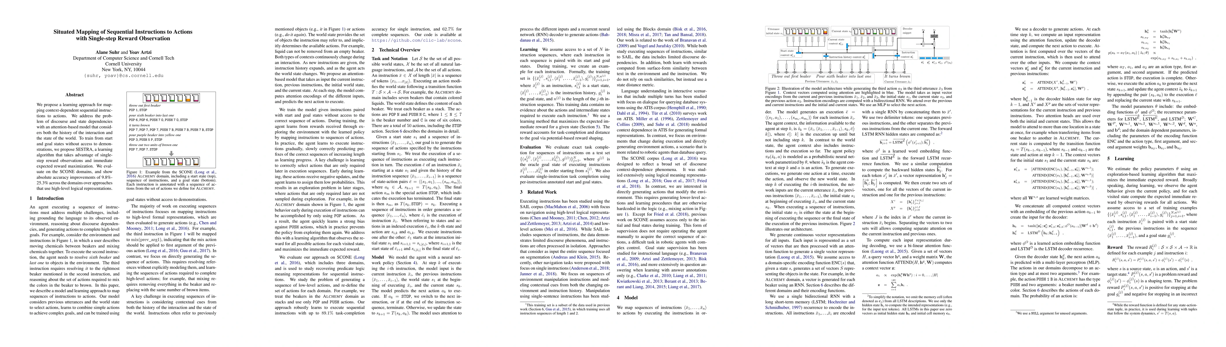 This paper introduces SESTRA, an attention-based learning algorithm for mapping context-dependent sequential instructions to actions, leveraging single-step reward observations. It demonstrates significant accuracy improvements of 9.8%-25.3% over high-level logical approaches in SCONE domains.