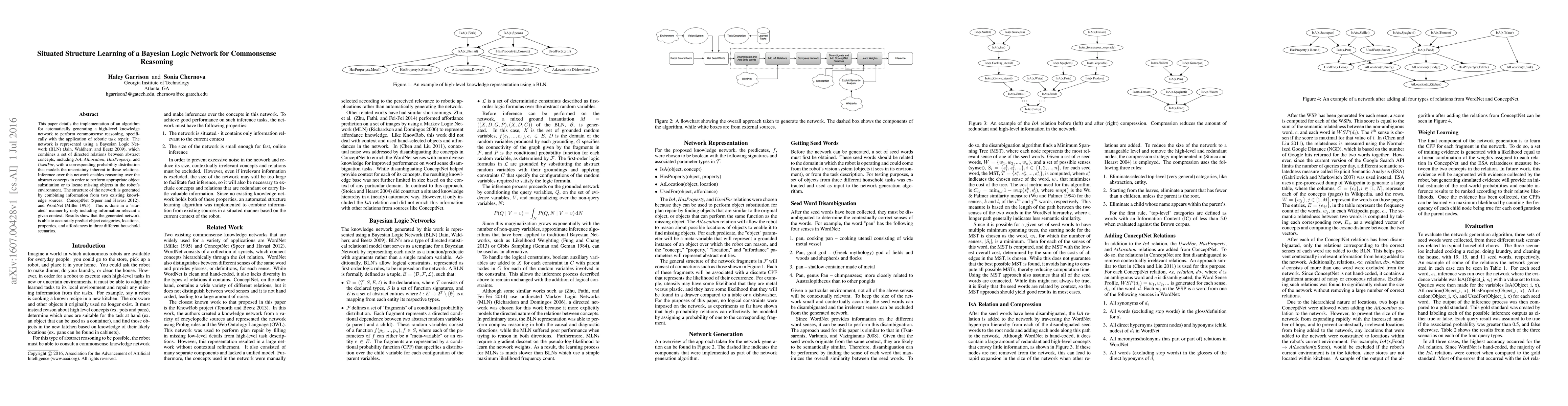This paper details the implementation of an algorithm for automatically generating a high-level knowledge network to perform commonsense reasoning, specifically with the application of robotic task repair. The network is represented using a Bayesian Logic Network (BLN) (Jain, Waldherr, and Beetz 2009), which combines a set of directed relations between abstract concepts, including IsA, AtLocation, HasProperty, and UsedFor, with a corresponding probability distribution that models the uncertainty inherent in these relations. Inference over this network enables reasoning over the abstract concepts in order to perform appropriate object substitution or to locate missing objects in the robot's environment. The structure of the network is generated by combining information from two existing knowledge sources: ConceptNet (Speer and Havasi 2012), and WordNet (Miller 1995). This is done in a "situated" manner by only including information relevant a given context. Results show that the generated network is able to accurately predict object categories, locations, properties, and affordances in three different household scenarios.